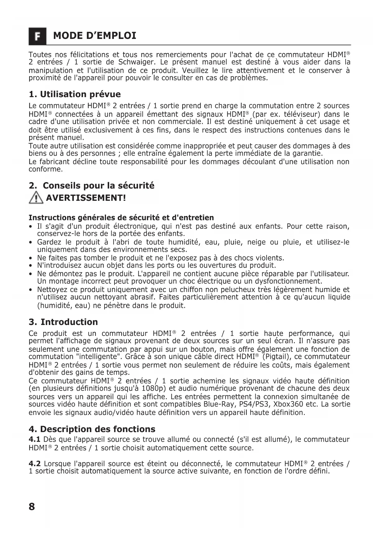 2 entrées / 1 sortie de Schwaiger. Le présent manuel est destiné à vous aider dans la manipulation et l'utilisation de ce produit. Veuillez le lire attentivement et le conserver à proximité de l'appareil pour pouvoir le consulter en cas de problèmes.