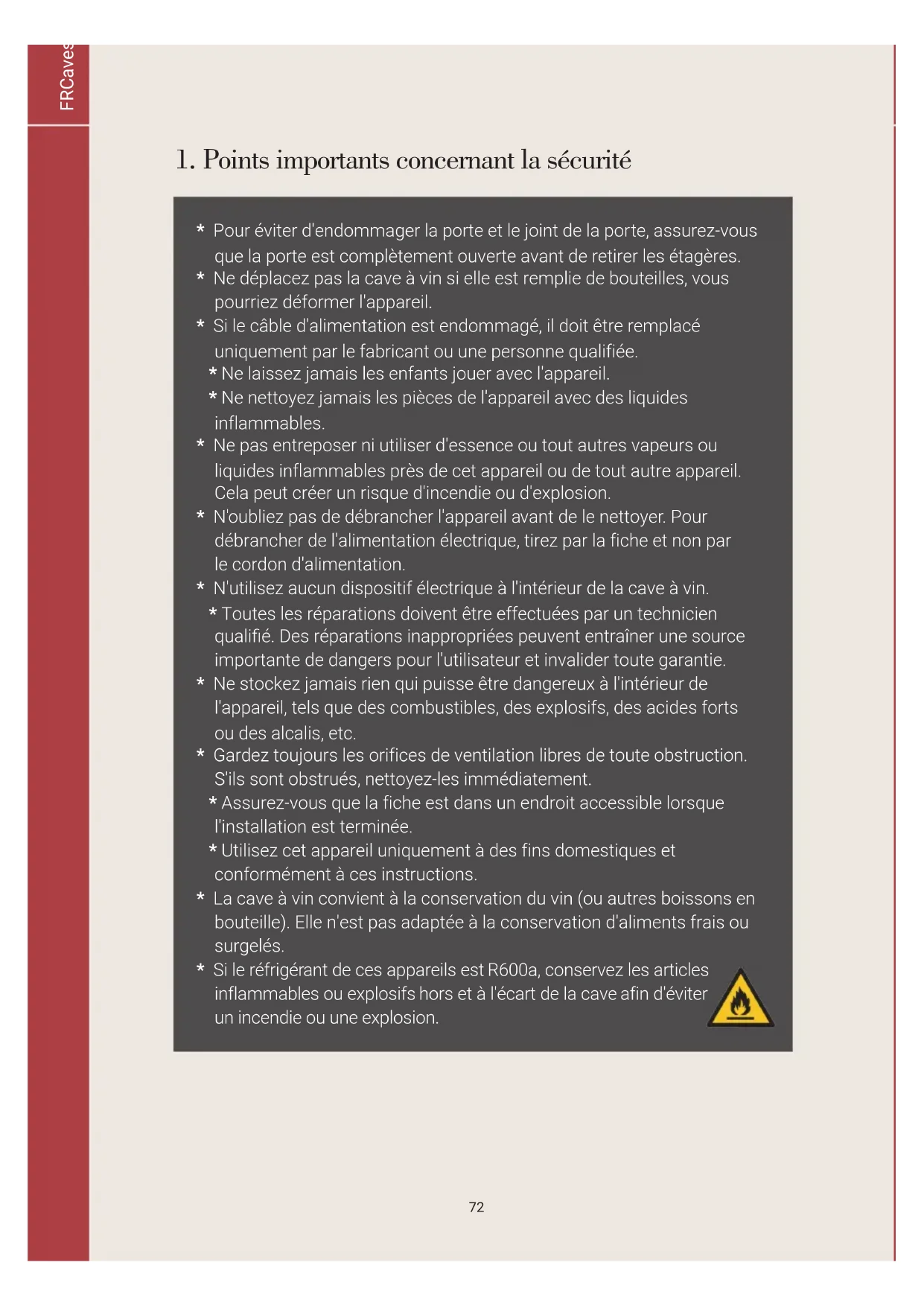 - Si le réfrigérant de ces appareils est R600a, conservez les articles inflammables ou explosifs hors et à l'écart de la cave afin d'éviter un incendie ou une explosion. FRCaves à vin Boretti/Guide de l'utilisateur - Conseils d'installation73 Avertissement