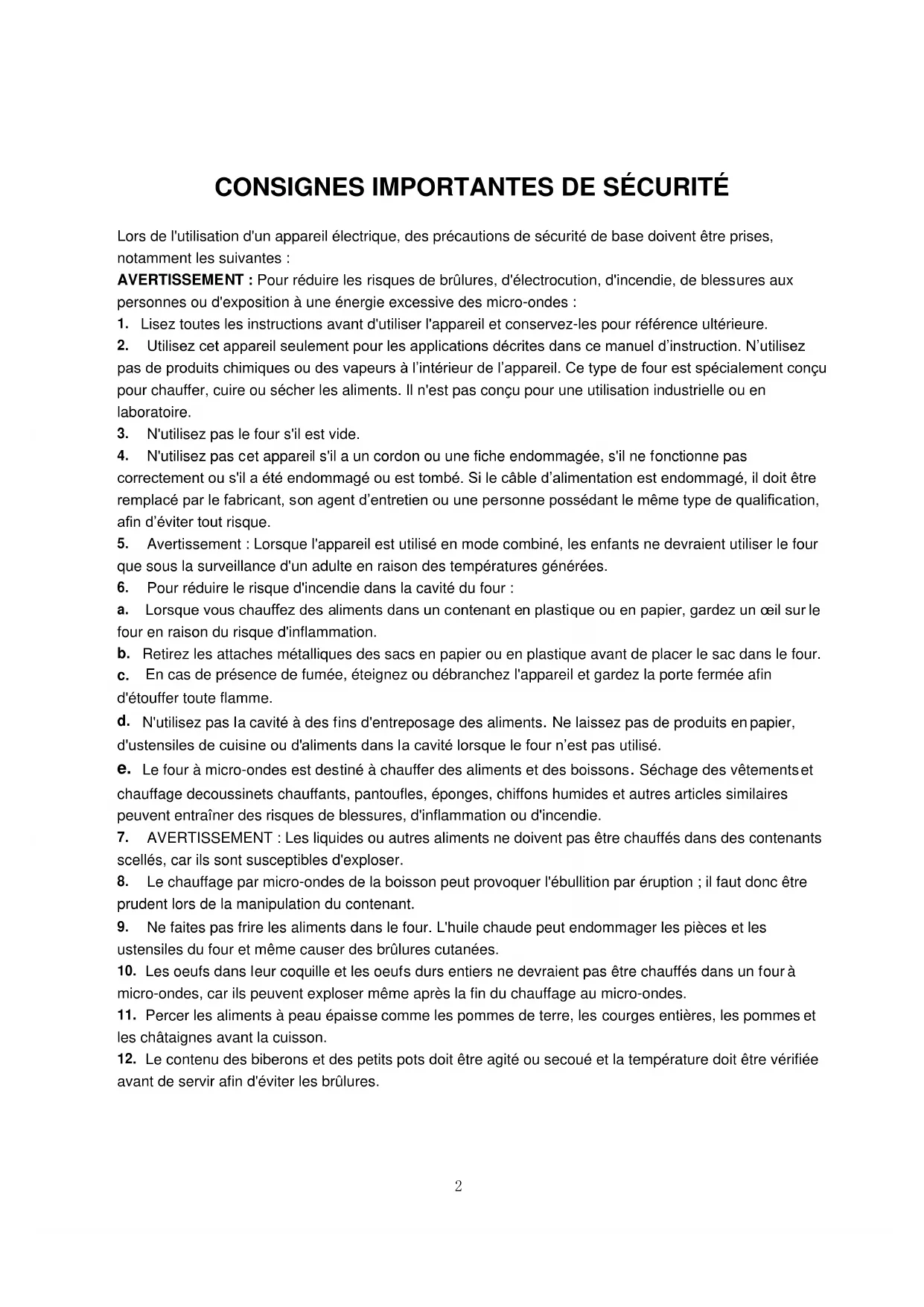 a. Lorsque vous chauffez des alimentés dans un contenant en plastique ou en papier, gardez un œil sur le four en raison du risque d'inflammation. b. Retirez les attaches métalliques des sacs en papier ou en plastique avant de placer le sac dans le four. c. En cas de présence de fumée, éteignez ou débranchez l'appareil et gardez la porte fermée afin d'étouffer toute flamme. d. N'utilise pas la cavité à des fins d'entreposage des alimentés. Ne laissez pas de produits en papier, d'ustensiles de cuisine ou d'aliments dans la cavité lorsque le four n'est pas utilisé. e. Le four à micro-ondes est destiné à chauffer des alimentés et des boissons. Séchage des vêtements et chauffage decoussinets chauffants, pantoufles, éponges, chiffons humides et autres articles similaires peuvent entraîner des risques de blessures, d'inflammation ou d'incendie. 7. AVENTISSEMENT : Les liquides ou autres alimentes ne doivent pas etre chauffes dans des contenants scellés, car ils sont susceptibles d'exploser. 8. Le chauffage par micro-ondes de la boisson peut provoquer l'ébullition par éruption; il faut donc être prudent lors de la manipulation du contenant. 9. Ne faites pas frire les alimentes dans le four. L'huile chaude peut endommager les pieces et les ustensiles du four et meme causer des brulures cutanees. 10. Les oeufs dans leur coquille et les oeufs durs entiers ne devraient pas ettre chauffes dans un four a micro-ondes, car ils peuvent exposer meme apres la fin du chauffage au micro-ondes. 11. Percer les alimentes à peu épaissé comme les pommes de terre, les courges entières, les pommes et les chataignes avant la cuisson. 12. Le contenu des biberons et des petits pots doit être agité ou secoué et la température doit être vérifiée avant de servir afin d'éviter les brûlures.
