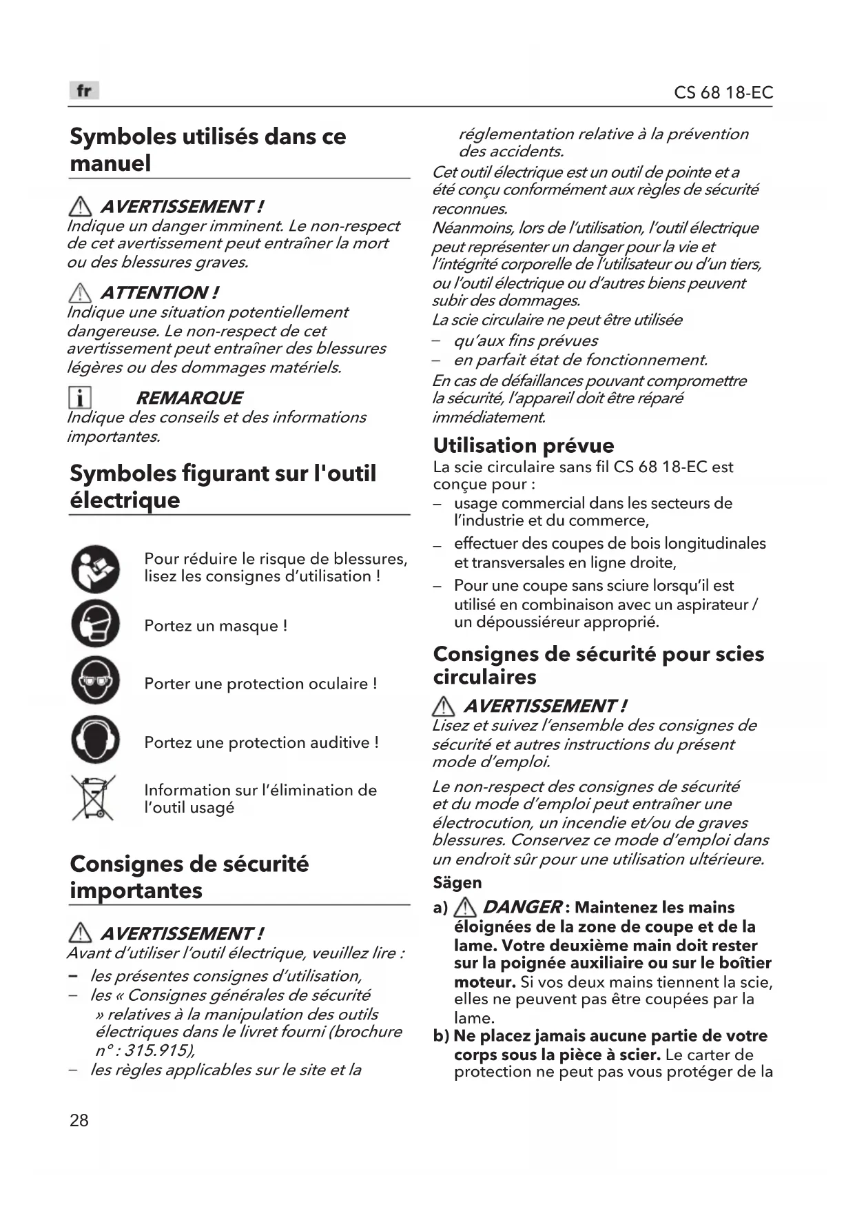 Exemption from liability The manufacturer and his representative are not liable for any damage and lost profit due to interruption in business caused by the product or by an unusable product. The manufacturer and his representative are not liable for any damage which was caused by improper use of the product or by use of the product with products from other manufacturers.28 CS 68 18-EC Symboles utilisés dans ce manuel AVERTISSEMENT ! Indique un danger imminent. Le non-respect de cet avertissement peut entraîner la mort ou des blessures graves. ATTENTION ! Indique une situation potentiellement dangereuse. Le non-respect de cet avertissement peut entraîner des blessures légères ou des dommages matériels. REMARQUE Indique des conseils et des informations importantes. Symboles figurant sur l'outil électrique Pour réduire le risque de blessures, lisez les consignes d’utilisation !Portez un masque !Porter une protection oculaire !Portez une protection auditive !Information sur l’élimination de l’outil usagé Consignes de sécurité importantes AVERTISSEMENT ! Avant d’utiliser l’outil électrique, veuillez lire : les présentes consignes d’utilisation, les « Consignes générales de sécurité » relatives à la manipulation des outils électriques dans le livret fourni (brochure n° : 315.915), les règles applicables sur le site et la réglementation relative à la prévention des accidents. Cet outil électrique est un outil de pointe et a été conçu conformément aux règles de sécurité reconnues. Néanmoins, lors de l’utilisation, l’outil électrique peut représenter un danger pour la vie et l’intégrité corporelle de l’utilisateur ou d’un tiers, ou l’outil électrique ou d’autres biens peuvent subir des dommages. La scie circulaire ne peut être utilisée qu’aux fins prévues en parfait état de fonctionnement. En cas de défaillances pouvant compromettre la sécurité, l’appareil doit être réparé immédiatement. Utilisation prévue La scie circulaire sans fil CS 68 18-EC est conçue pour :