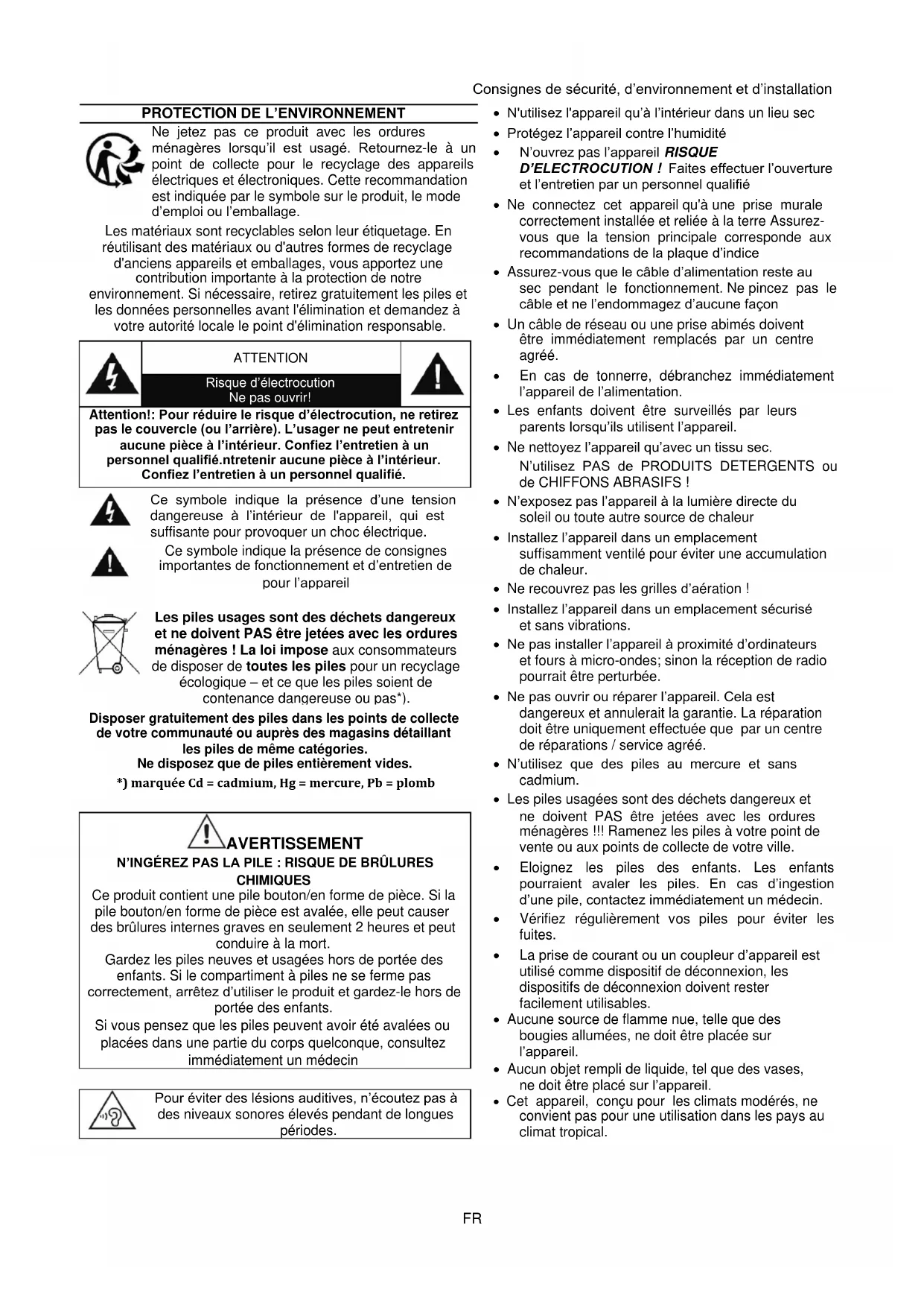 Disposer gratuitement des piles dans les points de collecte de votre communauté ou auprès des magasins détaillant les piles de même catégories. Ne disposez que de piles entièrement vides. *) marquée Cd = cadmium, Hg = mercure, Pb = plomb