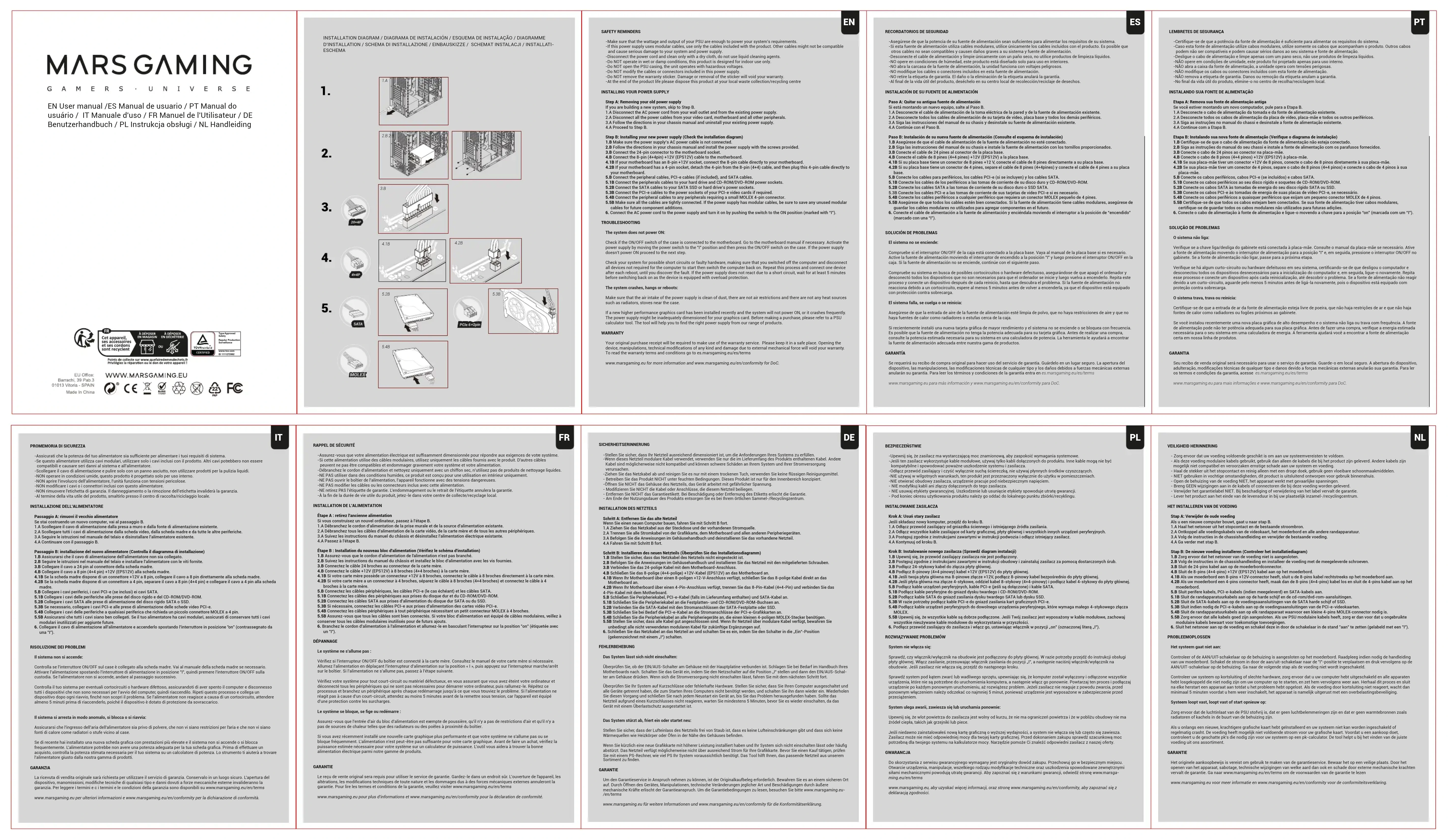 Étape A : retirez l'ancienne alimentation Si vous construisez un nouvel ordinateur, passez à l'étape B. 1.A Débranchez le cordon d'alimentation de la prise murale et de la source d'alimentation existante. 2.A Débranchez tous les câbles d'alimentation de la carte vidéo, de la carte mère et de tous les autres périphériques. 3.A Suivez les instructions du manuel du châssis et désinstallez l'alimentation électrique existante. 4.A Passez à l'étape B. Étape B : Installation du nouveau bloc d'alimentation (Vérifiez le schéma d'installation) 1.B Assurez-vous que le cordon d'alimentation de l'alimentation n'est pas branché. 2.B Suivez les instructions du manuel du châssis et installez le bloc d'alimentation avec les vis fournies. 3.B Connectez le câble 24 broches au connecteur de la carte mère. 4.B Connectez le câble +12V (EPS12V) à 8 broches (4+4 broches) à la carte mère. 4.1B Si votre carte mère possède un connecteur +12V à 8 broches, connectez le câble à 8 broches directement à la carte mère. 4.2B Si votre carte mère a un connecteur à 4 broches, séparez le câble à 8 broches (4+4 broches) et connectez le câble à 4 broches à la carte mère. 5.B Connectez les câbles périphériques, les câbles PCI-e (le cas échéant) et les câbles SATA. 5.1B Connectez les câbles des périphériques aux prises du disque dur et du CD-ROM/DVD-ROM. 5.2B Connectez les câbles SATA aux prises d'alimentation du disque dur SATA ou du SSD. 5.3B Si nécessaire, connectez les câbles PCI-e aux prises d'alimentation des cartes vidéo PCI-e. 5.4B Connectez les câbles périphériques à tout périphérique nécessitant un petit connecteur MOLEX à 4 broches. 5.5B Assurez-vous que tous les câbles sont bien connectés. Si votre bloc d'alimentation est équipé de câbles modulaires, veillez à conserver tous les câbles modulaires inutilisés pour de futurs ajouts. 6. Branchez le cordon d'alimentation à l'alimentation et allumez-le en basculant l'interrupteur sur la position "on" (étiquetée avec un "I"). DÉPANNAGE Le système ne s'allume pas : Vérifiez si l'interrupteur ON/OFF du boîtier est connecté à la carte mère. Consultez le manuel de votre carte mère si nécessaire. Allumez l'alimentation en déplaçant l'interrupteur d'alimentation sur la position « I », puis appuyez sur l'interrupteur marche/arrêt sur le boîtier. Si l'alimentation ne s'allume pas, passez à l'étape suivante. Vérifiez votre système pour tout court-circuit ou matériel défectueux, en vous assurant que vous avez éteint votre ordinateur et déconnecté tous les périphériques qui ne sont pas nécessaires pour démarrer votre ordinateur, puis rallumez-le. Répétez ce processus et branchez un périphérique après chaque redémarrage jusqu'à ce que vous trouviez le problème. Si l'alimentation ne réagit pas à cause d'un court-circuit, attendez au moins 5 minutes avant de la remettre sous tension, car l'appareil est équipé d'une protection contre les surcharges. Le système se bloque, se fige ou redémarre : Assurez-vous que l'entrée d'air du bloc d'alimentation est exempte de poussière, qu'il n'y a pas de restrictions d'air et qu'il n'y a pas de sources de chaleur telles que des radiateurs ou des poêles à proximité du boîtier. Si vous avez récemment installé une nouvelle carte graphique plus performante et que votre système ne s'allume pas ou se bloque fréquemment. L'alimentation n'est peut-être pas suffisante pour votre carte graphique. Avant de faire un achat, vérifiez la puissance estimée nécessaire pour votre système sur un calculateur de puissance. L'outil vous aidera à trouver la bonne alimentation électrique parmi notre gamme de produits. GARANTIE Le reçu de vente original sera requis pour utiliser le service de garantie. Gardez-le dans un endroit sûr. L'ouverture de l'appareil, les altérations, les modifications techniques de toute nature et les dommages dus à des forces mécaniques externes annuleront la garantie. Pour lire les termes et conditions de la garantie, veuillez visiter www.marsgaming.eu/en/terms www.marsgaming.eu pour plus d'informations et www.marsgaming.eu/en/conformity pour la déclaration de conformité. SICHERHEITSERINNERUNG -Stellen Sie sicher, dass Ihr Netzteil ausreichend dimensioniert ist, um die Anforderungen Ihres Systems zu erfüllen. -Wenn dieses Netzteil modulare Kabel verwendet, verwenden Sie nur die im Lieferumfang des Produkts enthaltenen Kabel. Andere Kabel sind möglicherweise nicht kompatibel und können schwere Schäden an Ihrem System und Ihrer Stromversorgung verursachen. -Ziehen Sie das Netzkabel ab und reinigen Sie es nur mit einem trockenen Tuch, verwenden Sie keine flüssigen Reinigungsmittel. - Betreiben Sie das Produkt NICHT unter feuchten Bedingungen. Dieses Produkt ist nur für den Innenbereich konzipiert. -Öffnen Sie NICHT das Gehäuse des Netzteils, das Gerät arbeitet mit gefährlicher Spannung. - Modifizieren Sie NICHT die Kabel oder Anschlüsse, die diesem Netzteil beiliegen. - Entfernen Sie NICHT das Garantieetikett. Bei Beschädigung oder Entfernung des Etiketts erlischt die Garantie. - Am Ende der Nutzungsdauer des Produkts entsorgen Sie es bei Ihrem örtlichen Sammel-/Recyclingzentrum.