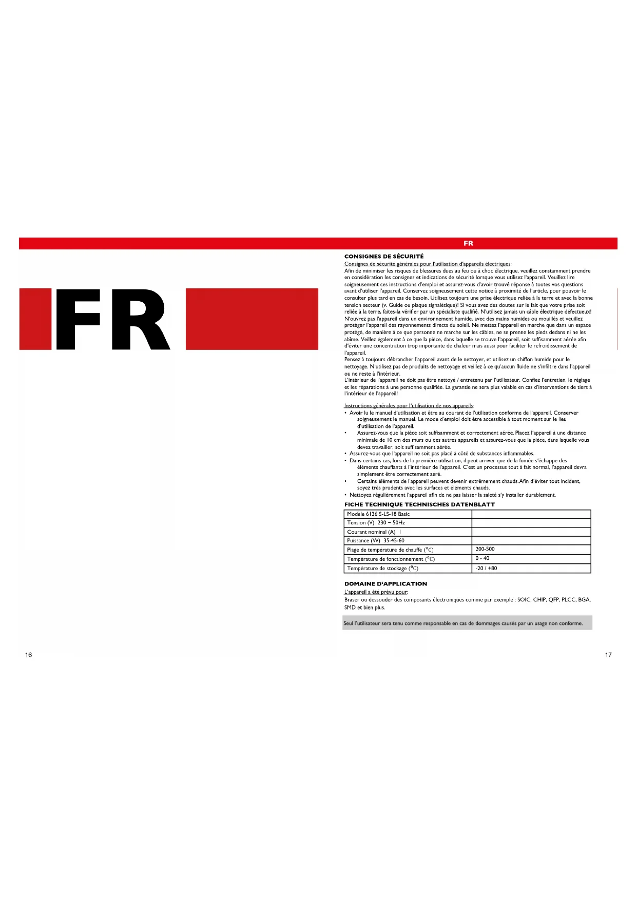 L‘appareil a été prévu pour: Braser ou dessouder des composants électroniques comme par exemple : SOIC, CHIP, QFP, PLCC, BGA, SMD et bien plus. Seul l’utilisateur sera tenu comme responsable en cas de dommages causés par un usage non conforme. FRFR