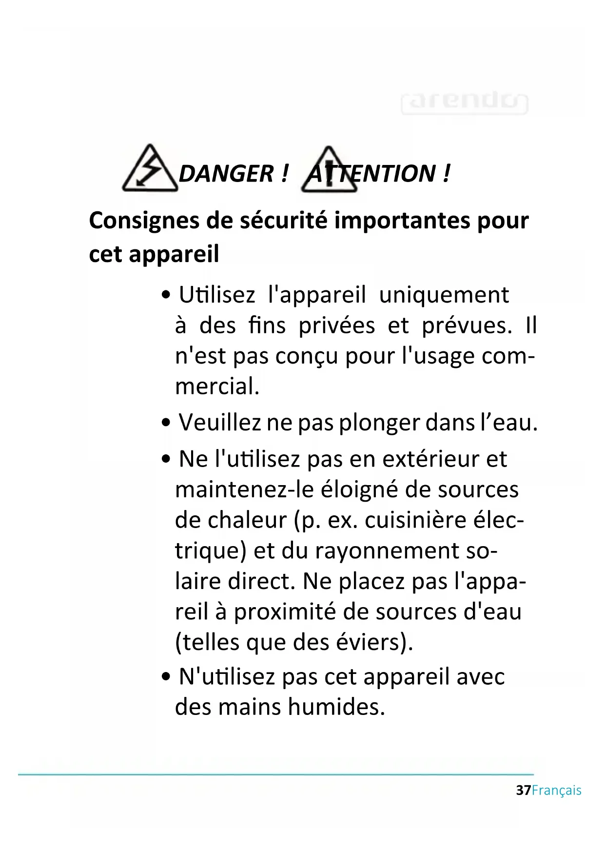 - Tenez les enfants éloignés de l’appareil. Veillez à ne pas jouer à proximité de l’appareil.43Français Nous vous remercions d'avoir acheté un produit d'Arendo. Pour vous assurer que vous appréciez l'appareil acheté pendant une longue période, veuillez lire aen- vement le mode d'emploi suivant. Avant la mise en service du produit livré, vériez s'il est complet, sans défauts et intact.