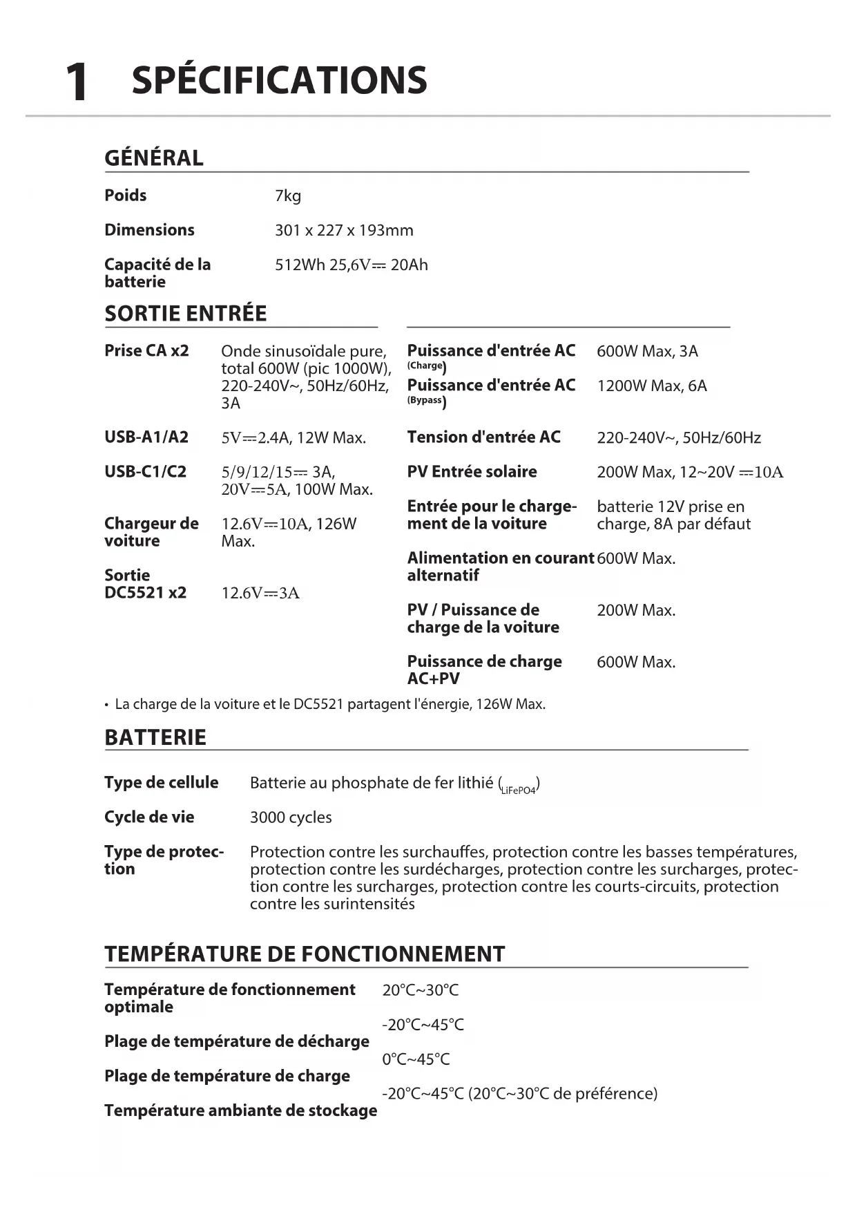 3000 cycles Protection contre les surchaues, protection contre les basses températures, protection contre les surdécharges, protection contre les surcharges, protec- tion contre les surcharges, protection contre les courts-circuits, protection contre les surintensités 20°C~30°C -20°C~45°C 0°C~45°C -20°C~45°C (20°C~30°C de préférence) 600W Max, 3A 1200W Max, 6A 220-240V~, 50Hz/60Hz 200W Max, 12~20V ⎓10A batterie 12V prise en charge, 8A par défaut 600W Max. 200W Max. 600W Max.