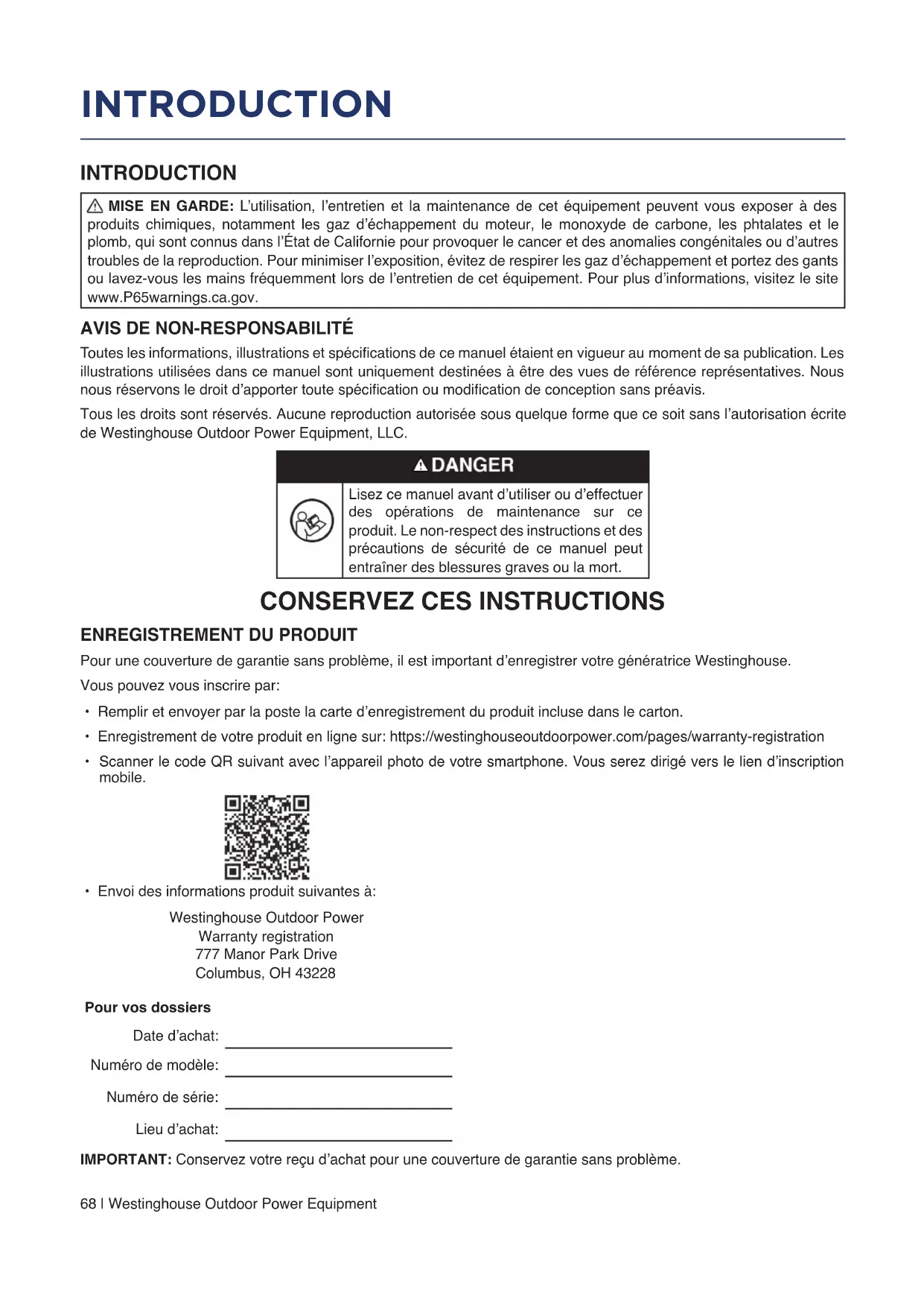 - Enregistrement de votre produit en ligne sur: https://westinghouseoutdoorpower.com/pages/warranty-registration
