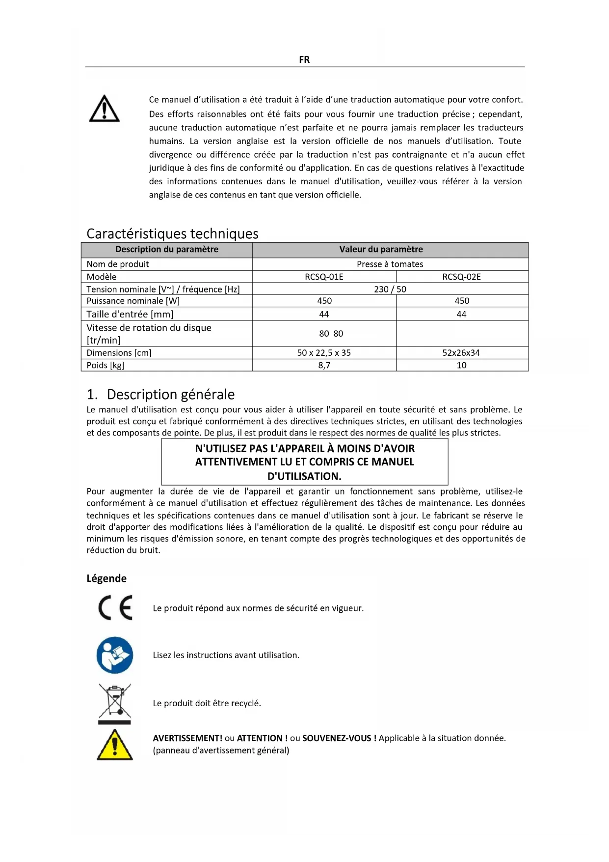 Le produit est destiné à séparer le jus de la pulpe de tomate. L'utilisateur est responsable de tout dommage résultant d'une utilisation non conforme de l'appareil. 3.1. Description de l'appareil RCSQ-01EFR