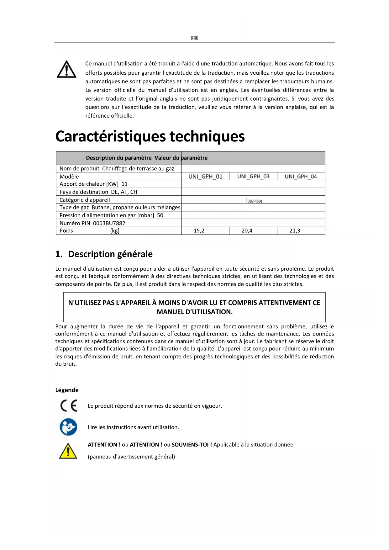 Le manuel d'utilisation est conçu pour aider à utiliser l'appareil en toute sécurité et sans problème. Le produit est conçu et fabriqué conformément à des directives techniques strictes, en utilisant des technologies et des composants de pointe. De plus, il est produit dans le respect des normes de qualité les plus strictes. N'UTILISEZ PAS L'APPAREIL À MOINS D'AVOIR LU ET COMPRIS ATTENTIVEMENT CE MANUEL D'UTILISATION. Pour augmenter la durée de vie de l'appareil et garantir un fonctionnement sans problème, utilisez-le conformément à ce manuel d'utilisation et effectuez régulièrement les tâches de maintenance. Les données techniques et spécifications contenues dans ce manuel d'utilisation sont à jour. Le fabricant se réserve le droit d'apporter des modifications liées à l'amélioration de la qualité. L'appareil est conçu pour réduire au minimum les risques d'émission de bruit, en tenant compte des progrès technologiques et des possibilités de réduction du bruit. Légende Le produit répond aux normes de sécurité en vigueur. Lire les instructions avant utilisation. ATTENTION ! ou ATTENTION ! ou SOUVIENS-TOI ! Applicable à la situation donnée. (panneau d'avertissement général)FR