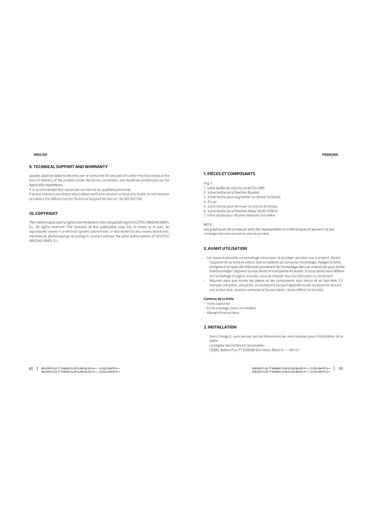 Les droits de propriété intellectuelle des textes de ce manuel appartiennent à CECOTEC INNOVACIONES, S.L. Tous droits réservés. Le contenu de cette publication ne peut être, en totalité ou en partie, reproduit, stocké dans un système de récupération de données, transmis ou distribué par quelque moyen que ce soit (électronique, mécanique, photocopie, enregistrement ou similaire) sans l’autorisation préalable de CECOTEC INNOVACIONES, S.L.BOLERO FLUX TT 608000 SLIM GLASS BLACK A++ / GLASS WHITE A++ BOLERO FLUX TT 908000 SLIM GLASS BLACK A++ / GLASS WHITE A++ BOLERO FLUX TT 608000 SLIM GLASS BLACK A++ / GLASS WHITE A++ BOLERO FLUX TT 908000 SLIM GLASS BLACK A++ / GLASS WHITE A++