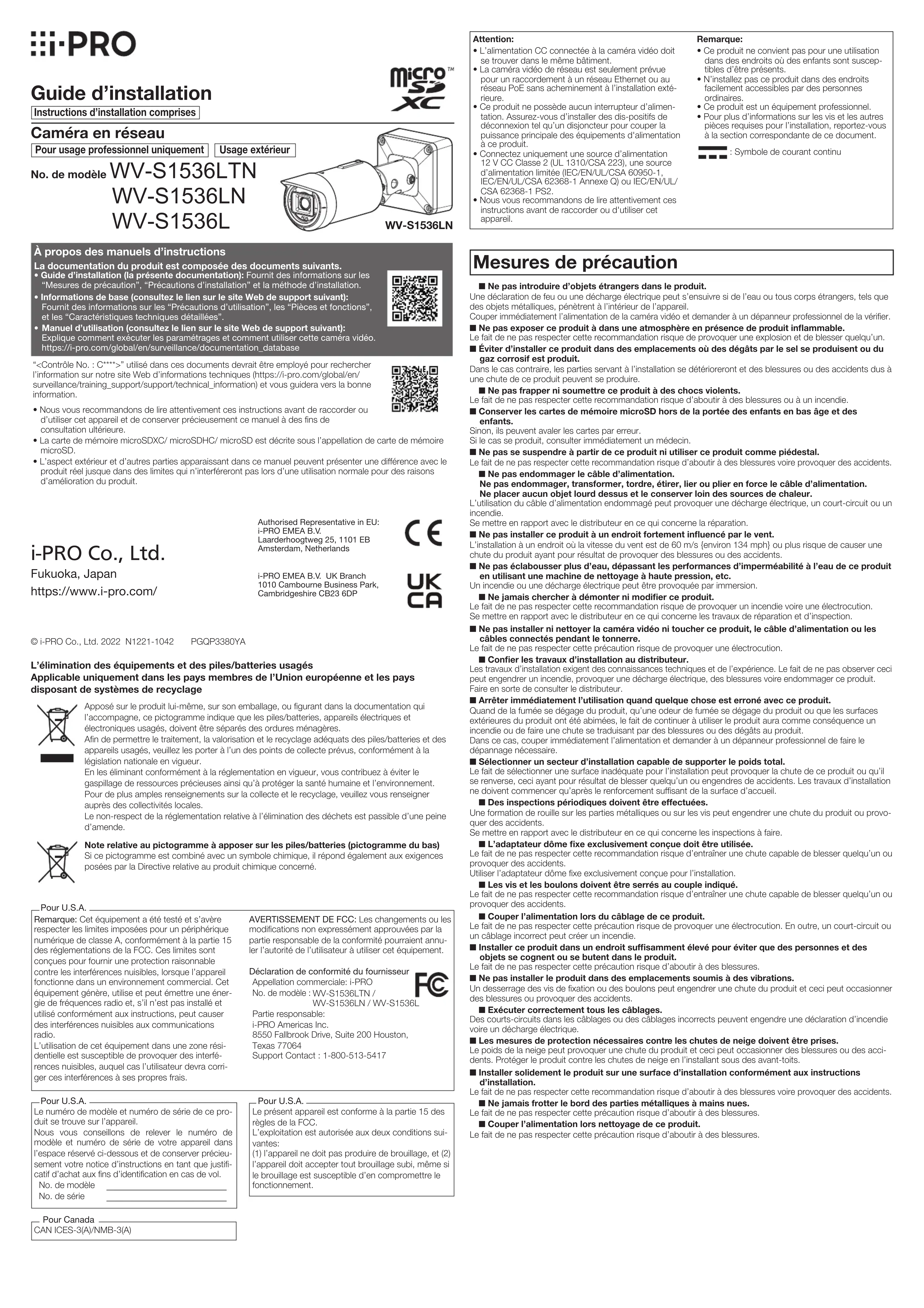 - Manuel d’utilisation (consultez le lien sur le site Web de support suivant): Explique comment exécuter les paramétrages et comment utiliser cette caméra vidéo. https://i-pro.com/global/en/surveillance/documentation_database“<Contrôle No. : C****>” utilisé dans ces documents devrait être employé pour rechercher l’information sur notre site Web d’informations techniques (https://i-pro.com/global/en/surveillance/training_support/support/technical_information) et vous guidera vers la bonne information.• Nous vous recommandons de lire attentivement ces instructions avant de raccorder ou d’utiliser cet appareil et de conserver précieusement ce manuel à des fins de consultation ultérieure.• La carte de mémoire microSDXC/ microSDHC/ microSD est décrite sous l’appellation de carte de mémoire microSD.• L’aspect extérieur et d’autres parties apparaissant dans ce manuel peuvent présenter une différence avec le produit réel jusque dans des limites qui n’interféreront pas lors d’une utilisation normale pour des raisons d’amélioration du produit.L’élimination des équipements et des piles/batteries usagésApplicable uniquement dans les pays membres de l’Union européenne et les pays disposant de systèmes de recyclageApposé sur le produit lui-même, sur son emballage, ou figurant dans la documentation qui l’accompagne, ce pictogramme indique que les piles/batteries, appareils électriques et électroniques usagés, doivent être séparés des ordures ménagères.Afin de permettre le traitement, la valorisation et le recyclage adéquats des piles/batteries et des appareils usagés, veuillez les porter à l’un des points de collecte prévus, conformément à la législation nationale en vigueur. En les éliminant conformément à la réglementation en vigueur, vous contribuez à éviter le gaspillage de ressources précieuses ainsi qu’à protéger la santé humaine et l’environnement.Pour de plus amples renseignements sur la collecte et le recyclage, veuillez vous renseigner auprès des collectivités locales. Le non-respect de la réglementation relative à l’élimination des déchets est passible d’une peine d’amende.Note relative au pictogramme à apposer sur les piles/batteries (pictogramme du bas)Si ce pictogramme est combiné avec un symbole chimique, il répond également aux exigences posées par la Directive relative au produit chimique concerné.Remarque: Cet équipement a été testé et s’avère respecter les limites imposées pour un périphérique numérique de classe A, conformément à la partie 15 des réglementations de la FCC. Ces limites sont conçues pour fournir une protection raisonnable contre les interférences nuisibles, lorsque l’appareil fonctionne dans un environnement commercial. Cet équipement génère, utilise et peut émettre une éner-gie de fréquences radio et, s’il n’est pas installé et utilisé conformément aux instructions, peut causer des interférences nuisibles aux communications radio.L’utilisation de cet équipement dans une zone rési-dentielle est susceptible de provoquer des interfé-rences nuisibles, auquel cas l’utilisateur devra corri-ger ces interférences à ses propres frais.AVERTISSEMENT DE FCC: Les changements ou les modifications non expressément approuvées par la partie responsable de la conformité pourraient annu-ler l’autorité de l’utilisateur à utiliser cet équipement.Déclaration de conformité du fournisseurAppellation commerciale: i-PRONo. de modèle : WV-S1536LTN / WV-S1536LN / WV-S1536LPartie responsable: i-PRO Americas Inc.8550 Fallbrook Drive, Suite 200 Houston,Texas 77064Support Contact : 1-800-513-5417Pour U.S.A.CAN ICES-3(A)/NMB-3(A)Pour CanadaLe numéro de modèle et numéro de série de ce pro-duit se trouve sur l’appareil.Nous vous conseillons de relever le numéro de modèle et numéro de série de votre appareil dans l’espace réservé ci-dessous et de conserver précieu-sement votre notice d’instructions en tant que justifi-catif d’achat aux fins d’identification en cas de vol. No. de modèle No. de sériePour U.S.A.Le présent appareil est conforme à la partie 15 des règles de la FCC.L’exploitation est autorisée aux deux conditions sui-vantes:(1) l’appareil ne doit pas produire de brouillage, et (2) l’appareil doit accepter tout brouillage subi, même si le brouillage est susceptible d’en compromettre le fonctionnement.Pour U.S.A. Guide d’installation Instructions d’installation comprisesPour usage professionnel uniquementUsage extérieur© i-PRO Co., Ltd. 2022 N1221-1042 PGQP3380YA i-PRO Co., Ltd. Fukuoka, Japanhttps://www.i-pro.com/ Authorised Representative in EU: i-PRO EMEA B.V. Laarderhoogtweg 25, 1101 EB Amsterdam, Netherlands i-PRO EMEA B.V. UK Branch 1010 Cambourne Business Park, Cambridgeshire CB23 6DPAu sujet des indications Les annotations suivantes sont employées lors de la description des fonctions limitées pour les modèles spécifiés.Les fonctions sans annotations sont prises en charge par tous les modèles.S153 6 LT Les fonctions avec cette annotation sont disponibles pendant l’utilisation de la série WV-S1536LTN.S1536LN Les fonctions avec cette annotation sont disponibles pendant l’utilisation de la série WV-S1536LN. S1536L Les fonctions avec cette annotation sont disponibles pendant l’utilisation de la série WV-S1536L.