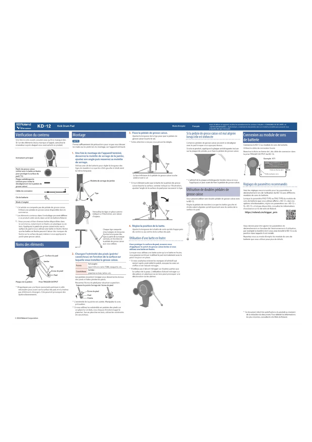 Ajustez la longueur de la batte de sorte qu’elle frappe près du centre ou au centre de la surface du pad. Utilisation d’une batte en feutre Pour protéger la surface du pad, assurez-vous d’appliquer le patch de grosse caisse inclus si vous utilisez une batte en feutre.Lorsque vous utilisez une batte autre qu’une batte en feutre, vous pouvez continuer à utiliser le pad normalement avec le patch toujours en place.* Si vous souhaitez enlever les marques (d’adhésif) qui restent après avoir retiré le patch, essuyez-les avec un chion et de l’alcool ménager.* N’utilisez pas d’alcool ménager sur d’autres parties que la surface de la peau. L’utilisation d’alcool ménager sur des pièces en plastique ou en bois peut provoquer une décoloration ou les abîmer. Si la pédale de grosse caisse est mal alignée lorsqu’elle est enfoncée Certaines pédales de grosse caisse peuvent se désaligner avec le pad lorsque vous appuyez dessus.Si cela se produit, appliquez la plaque antidérapante incluse sur la plaque de pédale, puis xez la pédale de grosse caisse.* L’adhésif de la plaque antidérapante tiendra mieux si vous l’appliquez un jour avant de xer la pédale de grosse caisse. Utilisation de doubles pédales de grossecaisse Vous pouvez utiliser une double pédale de grosse caisse avec le KD-12.Réglez la pédale de manière à ce que les battes gauche et droite soient alignées symétriquement avec le centre de la surface du pad. Connexion au module de sons debatterie Connectez le KD-12 au module de sons de batterie.Utilisez le câble de connexion fourni.Branchez la che en forme de L du câble de connexion dans la prise TRIGGER OUTPUT du KD-12.Exemple: V71Fiche en forme de I KICK Fiche en forme de L Réglages de paramètres recommandés Voici les réglages recommandés pour les paramètres de déclenchement lors de l’utilisation du KD-12 avec diérents modules de sons de batterie.Lorsque le paramètre PAD TYPE ou TRIG TYPE du module de sons de batterie que vous utilisez ache «KD-12» dans les options sélectionnables, réglez ces paramètres sur «KD-12». Si «KD-12» n’est pas disponible, consultez les informations d’assistance sur le site web de Roland.https://roland.cm/trigger_prmVous devrez peut-être ajuster les paramètres de déclenchement en fonction de l’environnement d’utilisation, par exemple la manière dont vous avez installé le KD-12 ou la position dans laquelle il est installé.Reportez-vous au mode d’emploi du module de sons de batterie que vous utilisez pour plus de détails.© 2024 Roland CorporationAvant d’utiliser cet appareil, veuillez lire attentivement les sections intitulées «CONSIGNES DE SÉCURITÉ» et «NOTES IMPORTANTES». Après lecture, conservez les documents dans un endroit accessible pour pouvoir vous yreporter dès que nécessaire.FrançaisMode d’emploi* Ce document décrit les spécications du produit au moment de la rédaction du document. Pour obtenir les informations les plus récentes, consultez le site Web de Roland.