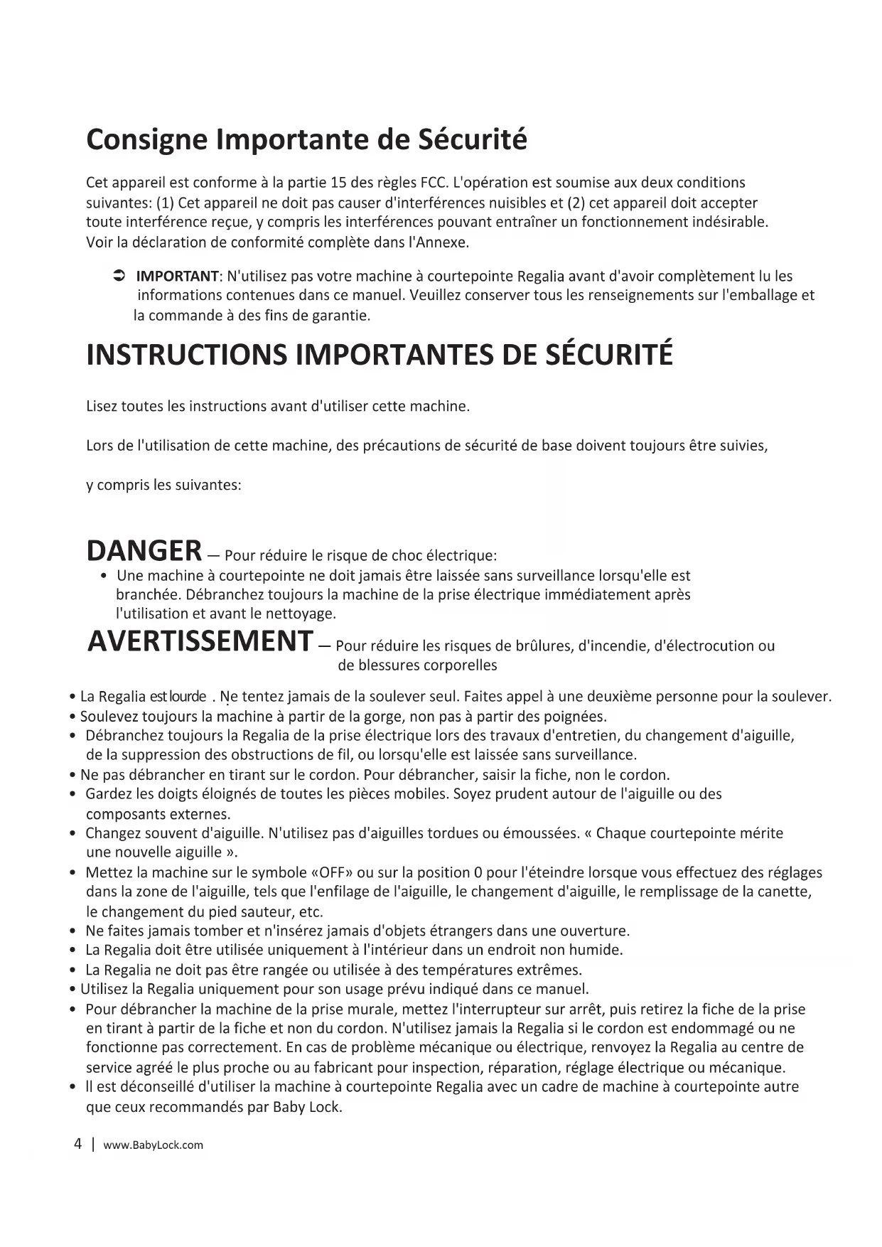 REMARQUE: Une REMARQUE indique des informations importantes qui vous aident à mieux utiliser votre produit Baby Lock. Â IMPORTANT: Une remarque IMPORTANT fournit des informations essentielles à l'utilisation correcte de votre produit Baby Lock U MISE EN GARDE: Une MISE EN GARDE indique un risque d'endommager votre courtepointe, la couette, ou pour vous même ASTUCE POUR LA COURTEPOINTE4 | www.BabyLock.com Consigne Importante de Sécurité Cet appareil est conforme à la partie 15 des règles FCC. L'opération est soumise aux deux conditions suivantes: (1) Cet appareil ne doit pas causer d'interférences nuisibles et (2) cet appareil doit accepter toute interférence reçue, y compris les interférences pouvant entraîner un fonctionnement indésirable. Voir la déclaration de conformité complète dans l'Annexe. Â IMPORTANT: N'utilisez pas votre machine à courtepointe Regalia avant d'avoir complètement lu les informations contenues dans ce manuel. Veuillez conserver tous les renseignements sur l'emballage et la commande à des fins de garantie.