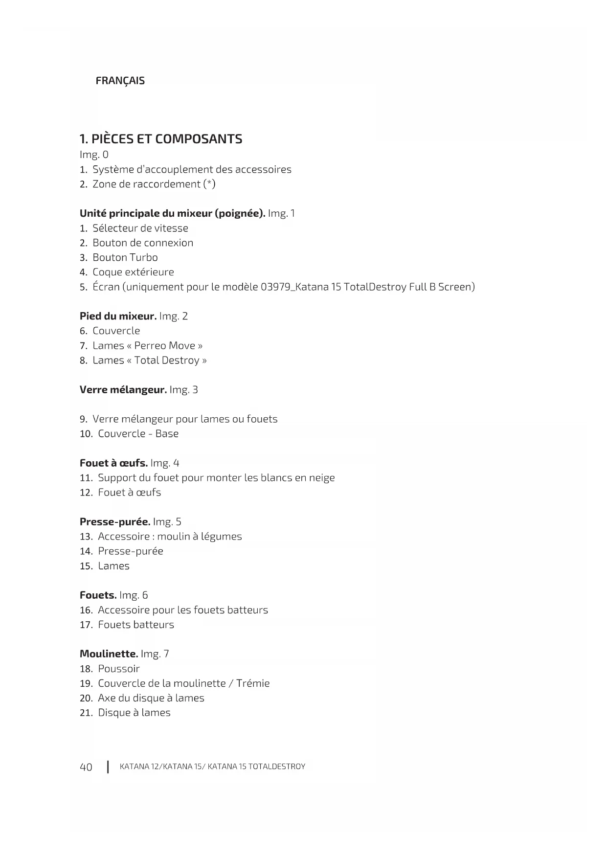 FRANÇAIS Mixeur plongeant Katana 12/15 Chop B/G - Pied du mixeur plongeant avec technologie «Perreo Move» - Verre mélangeur avec couvercle-base antidérapant - Fouets pour monter les blancs en neige - Bol-hachoir Mixeur plongeant Katana 15 Smash B - Pied du mixeur plongeant avec technologie «Perreo Move» - Verre mélangeur avec couvercle-base antidérapant - Fouets pour monter les blancs en neige - Fouets batteurs - Bol-hachoir - Presse-purée Mixeur plongeant Katana 15 TotalDestroy Jar B/G - Pied du mixeur plongeant avec technologie «Perreo Move» et «TotalDestroy» - Verre mélangeur avec couvercle-base antidérapant Mixeur plongeant Katana 15 TotalDestroy Cream B - Pied du mixeur plongeant avec technologie «Perreo Move» et «TotalDestroy» - Verre mélangeur avec couvercle-base antidérapant - Fouets pour monter les blancs en neige Mixeur plongeant Katana 15 TotalDestroy Chop B - Pied du mixeur plongeant avec technologie «Perreo Move» - Verre mélangeur avec couvercle-base antidérapant - Fouets pour monter les blancs en neige - Bol-hachoir Mixeur plongeant Katana 15 TotalDestroy Smash B - Pied du mixeur plongeant avec technologie «Perreo Move» et «TotalDestroy» - Verre mélangeur avec couvercle-base antidérapant - Fouets pour monter les blancs en neige - Fouets batteurs - Bol-hachoir - Presse-purée Mixeur plongeant Katana 15 TotalDestroy Full B/B Screen - Pied du mixeur plongeant avec technologie «Perreo Move» et «TotalDestroy» - Verre mélangeur avec couvercle-base antidérapant - Fouets pour monter les blancs en neigeKATANA 12/KATANA 15/ KATANA 15 TOTALDESTROY