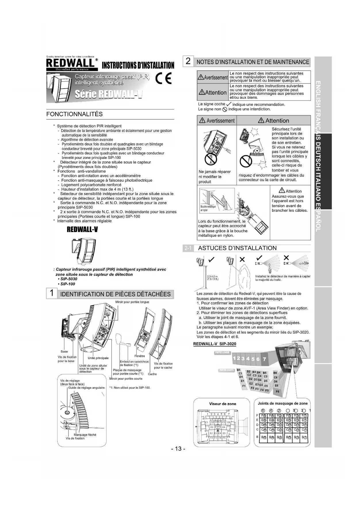 - Système de détection PIR intelligent- Détection de la température ambiante et éclairement pour une gestion automatique de la sensibilité- Algorithme de détection avancée Pyroéleménts deux fois doubles et quadruples avec un blindage conducteur breveté pour zone principale SIP-5030 Pyroéleménts deux fois quadruples avec un blindage conducteur breveté pour zone principale SIP-100* Détecteur intégré de la zone située sous le capteur (Pyroéléments deux fois doubles) * Fonctions anti-vandalisme- Fonction anti-rotation avec un accéléromètre- Fonction anti-masquage à faisceau photoélectrique- Logement polycarbonate renforcé- Hauteur d'installation max de 4 m (13 ft.)* Sélecteur de sensibilité indépendant pour la zone située sous le capteur de détecteur, la portées courte et la portées longue* Sortie à commande N.C. et N.O. indépendante pour la zone principale SIP-5030* 2 x sortie à commande N.C. et N.O. indépendante pour les zones principales (Portées courte et longue) SIP-100* Intervalle des alarmes réglable REDWALL-V : Capteur infrarouge passif (PIR) intelligent synthétisé avec zone située sous le capteur de détectionSIP-5030SIP-100