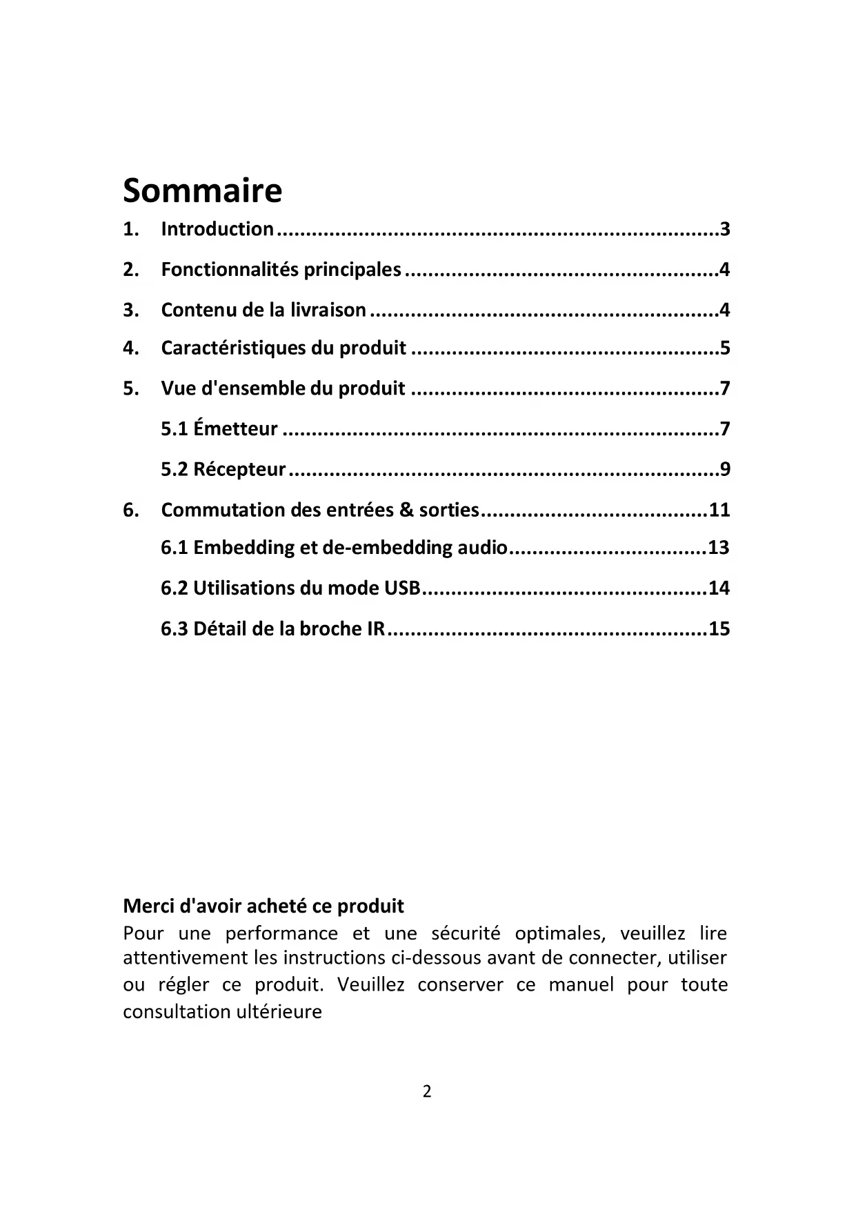Merci d'avoir acheté ce produit Pour une performance et une sécurité optimales, veuillez lire attentivement les instructions ci-dessous avant de connecter, utiliser ou régler ce produit. Veuillez conserver ce manuel pour toute consultation ultérieure3 Recommandation d'un dispositif de protection contre les surtensions Ce produit contient des composants électriques fragiles qui peuvent être endommagés par des surtensions, des chocs électriques, des éclairs, etc. L'utilisation de systèmes de protection contre les surtensions est fortement recommandée afin de protéger et de prolonger la durée de vie de votre équipement.