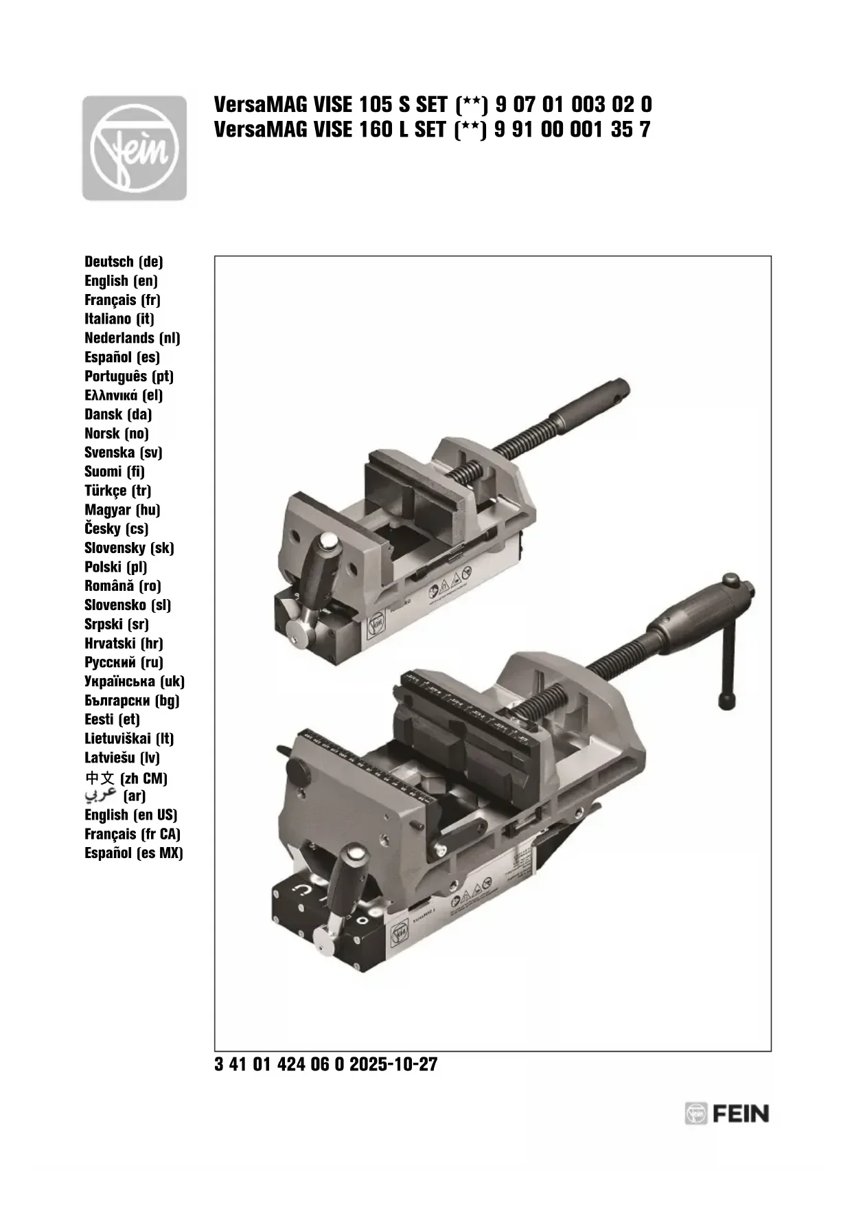 Pour votre sécurité. Lire toutes les consignes de sécurité et instructions. Le non-respect des consignes de sécurité et instructions peut provoquer des blessures graves. Conserver toutes les consignes de sécurité et toutes les instructions pour pouvoir s’y reporter ultérieurement. Ne pas utiliser ce produit avant d’avoir soigneu- sement lu et parfaitement compris cette notice d’utilisation. Conserver ces documents pour une utilisation ultérieure et les joindre au produit en cas de transmission ou de vente à une tierce personne. De même, respecter les dispositions concernant la pré- vention des accidents du travail en vigueur dans le pays en question. Utilisation conforme. Les aimants permanents VersaMAG avec étau (**) ser- vent, conformément à leur destination, au : – serrage par adhérence de pièces pour l’usinage à l’aide d’outils manuels et de perceuses verticales – positionnement sur des matériaux magnétisables, propres, exempts de rouille, de revêtement, de glace et plats à partir d’une épaisseur de 12 mm pour une utilisation professionnelle avec les embouts et accessoires agréés par FEIN pour le produit (voir www.fein.com) dans un environnement protégé contre les intempéries. Utilisation uniquement sur un sol sta- ble. L’appareil ne doit être utilisé que par des personnes ini- tiées à son utilisation et à son maniement. Toute autre utilisation est considérée comme non conforme. L’utilisateur assume lui seul toute responsabilité pour les dommages dus à une utilisation non conforme à la conception de l’appareil. Utilisation erronée prévisible Afin d’utiliser le produit en toute sécurité et d’exclure toute mauvaise utilisation, les opérations suivantes sont interdites : – modifications arbitraires – percer des trous dans le produit et l’aimant perma- nent – Serrage de pièces à usiner sans adhérence – utilisation non conforme, notamment (mais pas exclusivement) : — utilisation de matériaux non magnétisables — blocage de pièces à usiner sur la surface magnétisable — utilisation d’embouts non autorisés, — utilisation comme aimant de levage, — utilisation comme marche ou poignée pour aide à l’ascension, — utilisation dans des machines-outils telles que par ex. les fraiseuses – non-respect des consignes d’utilisation, – dépassement des valeurs indiquées dans cette notice d’utilisation Instructions particulières de sécurité. Maintenir la zone de travail propre et bien éclairée. Un lieu de travail en désordre ou mal éclairé augmente le risque d’accidents. S’habiller de manière adaptée. Ne pas porter de vête- ments amples ou de bijoux. Garder les cheveux, les vêtements et les gants à distance des parties mobiles. Des vêtements amples, des bijoux ou des cheveux longs peuvent être pris dans les parties mobiles. Sécuriser le produit uniquement avec la sangle livrée. Tenir d’autres personnes éloignées durant l’utilisation du produit. Lors des opérations de perçage, sécuriser en outre le produit par complémentarité de forme pour l’empêcher de tourner. Toujours serrer les pièces à usiner avec une force de serrage suffisante. Une pièce qui n’est pas bien fixée peut se détacher et provoquer des blessures. La broche de l’étau ne doit pas être entraînée par des outils électriques. Tenir l’aimant éloigné des personnes portant un stimu- lateur cardiaque. Utiliser l’aimant exclusivement à une température ambiante comprise entre –15 °C et +45 °C. Il est interdit de visser ou de riveter des plaques ou des repères sur le produit. Cela peut endommager les aimants. Ne pas utiliser des accessoires qui n’ont pas été spécia- lement conçus ou autorisés par FEIN. Transport. Transport aérien Les champs magnétiques provenant d'aimants mal emballés pourraient influer sur les appareils de naviga- tion des avions. Dans le pire des cas, cela peut entraîner un accident. N’expédier les aimants que dans des emballages avec blindage magnétique suffisant. Respecter les règlements correspondants. Mise en service. Avant de travailler avec le produit, s’assurer que les vis de serrage sont bien serrées. Tenir d’autres personnes éloignées durant l’utilisation du produit. Instructions d’utilisation. Utiliser un équipement de protection individuelle adap- té à l’application. Utiliser l’aimant uniquement sur une surface magnéti- que avec une épaisseur de paroi de 12 mm min. Veiller à ce que la surface sur laquelle est posée l’embase électromagnétique soit plane, propre et exempte de rouille. Enlever les couches de vernis et de mastic et autres matériaux. Éviter un entrefer entre l’embase électromagnétique et la surface de fixation. L’entrefer réduit la force d’attraction magnétique. Ne pas utiliser cette machine sur des surfaces chaudes > 80 °C ; ceci pourrait entraîner une réduction irréver- sible de la force d’attraction magnétique. Ne percer les pièces qu’à l’intérieur de la zone de ser- rage. AVERTISSEMENT31