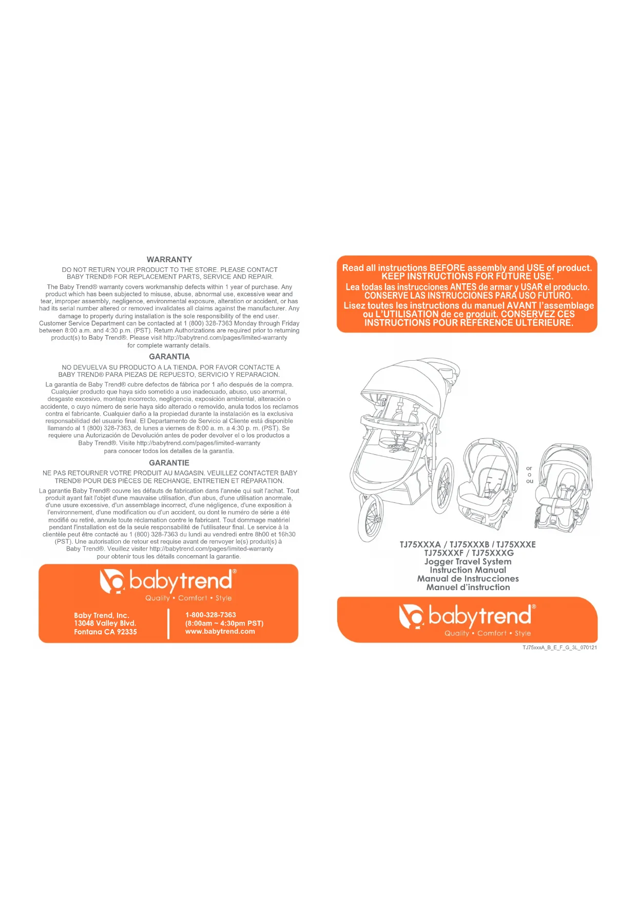 SERVICE CLIENT Le service client peut être contacté au 1 (800) 328-7363 du lundi au vendredi 8 h – 16 h 30 (PST). Une autorisation sera nécessaire avant de retourner le produit à Baby Trend®. www.babytrend.com