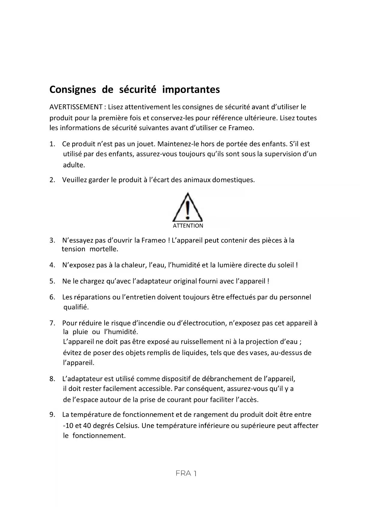 produit pour la première fois et conservez-les pour référence ultérieure. Lisez toutes les informations de sécurité suivantes avant d’utiliser ce Frameo.