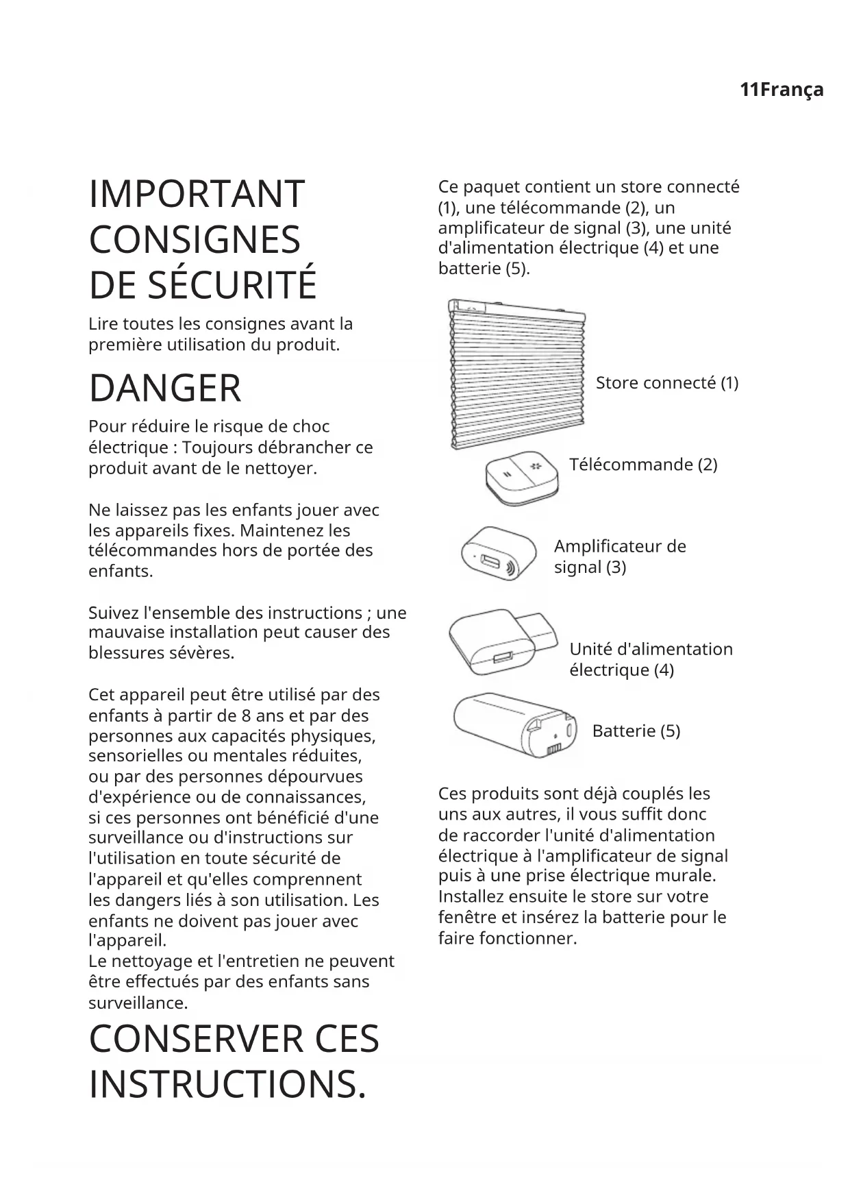 Lire toutes les consignes avant la première utilisation du produit. DANGER Pour réduire le risque de choc électrique : Toujours débrancher ce produit avant de le nettoyer. Ne laissez pas les enfants jouer avec les appareils xes. Maintenez les télécommandes hors de portée des enfants. Suivez l'ensemble des instructions ; une mauvaise installation peut causer des blessures sévères. Cet appareil peut être utilisé par des enfants à partir de 8 ans et par des personnes aux capacités physiques, sensorielles ou mentales réduites, ou par des personnes dépourvues d'expérience ou de connaissances, si ces personnes ont bénécié d'une surveillance ou d'instructions sur l'utilisation en toute sécurité de l'appareil et qu'elles comprennent les dangers liés à son utilisation. Les enfants ne doivent pas jouer avec l'appareil. Le nettoyage et l'entretien ne peuvent être eectués par des enfants sans surveillance. CONSERVER CES INSTRUCTIONS. Ce paquet contient un store connecté (1), une télécommande (2), un amplicateur de signal (3), une unité d'alimentation électrique (4) et une batterie (5). Ces produits sont déjà couplés les uns aux autres, il vous sut donc de raccorder l'unité d'alimentation électrique à l'amplicateur de signal puis à une prise électrique murale. Installez ensuite le store sur votre fenêtre et insérez la batterie pour le faire fonctionner. Store connecté (1) Télécommande (2) Amplicateur de signal (3) Unité d'alimentation électrique (4) Batterie (5)12 Instructions d'utilisation Brancher l’unité d'alimentation électrique à la prise murale, insérer l'amplicateur de signal dans le port libre. Pour le chargement, utiliser uniquement un câble USB recommandé et remplacer immédiatement les câbles présentant des défauts. Fonctions télécommandées Haut : Presser pour lever le store connecté. Bas : Presser pour baisser le store connecté. Couplage : ajouter des produits IKEA connectés (IKEA Home smart) à votre système. Important : l'amplicateur de signal doit être branché et alimenté pour pouvoir commander le store à partir de la télécommande. Fonction de l'amplicateur de signal Grâce à l'amplicateur de signal TRÅDFRI, vous pouvez étendre la portée du signal de vos produits connecté IKEA (IKEA Home smart). Utilisation du store connecté Pour lever entièrement le store : Appuyer une fois (brièvement) sur le bouton vers le haut de la télécommande ou du store. Pour baisser entièrement le store : Appuyer une fois (brièvement) sur le bouton vers le bas de la télécommande ou du store. Pour lever le store : Maintenir enfoncé le bouton vers le haut de la télécommande ou du store. Le store s'ouvre tant que le bouton est maintenu enfoncé. Lâcher le bouton quand le store est à la hauteur désirée ou quand il est entièrement levé. Pour baisser le store : Maintenir enfoncé le bouton vers le bas de la télécommande ou du store. Le store se ferme tant que le bouton est maintenu enfoncé. Lâcher le bouton quand le store est à la hauteur désirée ou quand il est entièrement baissé. Régler à la hauteur minimum souhaitée : Seuls les boutons sur le store peuvent être utilisés pour ce réglage. Placer le store à la hauteur souhaitée. Presser ensuite brièvement vers le haut ou le bas le bouton sur le store pour conserver cette position comme hauteur minimum souhaitée. Le store va se déplacer très légèrement vers le haut et le bas pour conrmer le réglage.13 Régler une nouvelle hauteur minimum : Pour modier la hauteur minimum ou revenir à la hauteur minimum par défaut, commencer par déplacer le store à la position haute. Presser ensuite deux fois le bouton du store vers le haut ou le bas. Le store va se déplacer très légèrement vers le haut et le bas pour conrmer le réglage. Répéter les étapes ci-dessus pour régler une nouvelle hauteur minimum souhaitée. Régler l'équilibre du store : Si le store se bloque à la descente, il se peut qu'il soit mal équilibré. Lever entièrement le store avant de le replacer au niveau souhaité. Ajouter des équipements à la télécommande : Couplage : ajouter des produits IKEA connectés (IKEA Home smart) à votre système. > 10 s Suivez les étapes suivantes pour ajouter d'autres stores. Assurez-vous que votre store connecté soit sous tension.