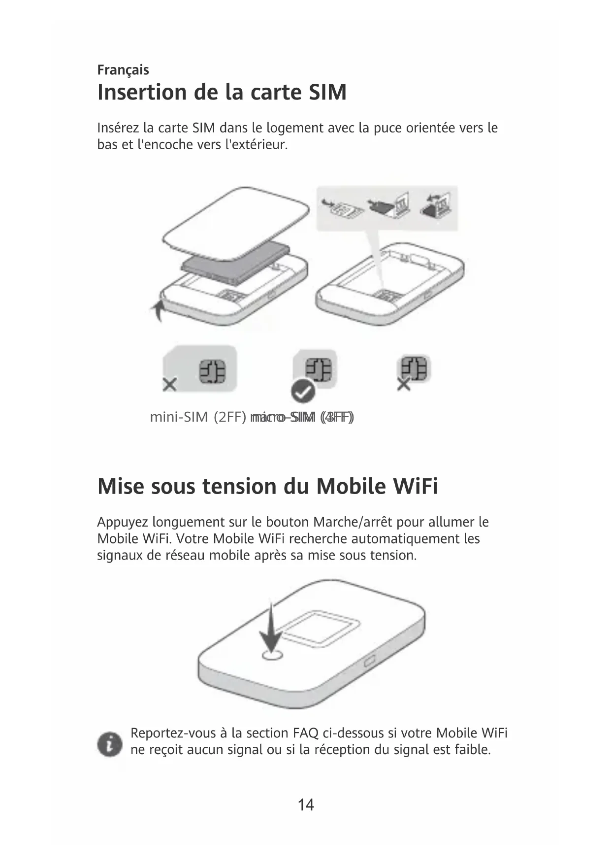 - S'il n'y a pas de réponse après avoir appuyé sur le bouton marche/arrêt, votre Mobile WiFi est éteint. Appuyez longuement sur le bouton marche/arrêt pour l'allumer. Évitez d'utiliser votre Mobile WiFi lorsque les appareils sans l actifs sont interdits (comme pendant les vols), et assurez-vous qu'il est éteint. Mention légale Copyright © Huawei 2021. Tous droits réservés. Aucune partie de ce manuel ne peut être reproduite ou transmise dans toute forme ou par tout moyen que ce soit sans accord préalable par écrit de Huawei Technologies Co., Ltd. et de ses aliés (« Huawei »). Le produit décrit dans ce manuel peut inclure des logiciels sous licence de Huawei et d'éventuels concédants. Les clients ne peuvent en aucun cas reproduire, distribuer, modier, décompiler, désassembler, décrypter, extraire, faire de l'ingénierie inversée, louer ou transférer ledit logiciel, ni en accorder des sous-licences 18d'utilisation, sauf si la législation en vigueur interdit ces restrictions ou si ces actions sont approuvées par les détenteurs des droits d'auteur concernés. Marques de commerce et autorisations , et sont des marques de commerce ou des marques déposées de Huawei Technologies Co., Ltd. LTE est une marque de commerce de ETSI. Wi-Fi