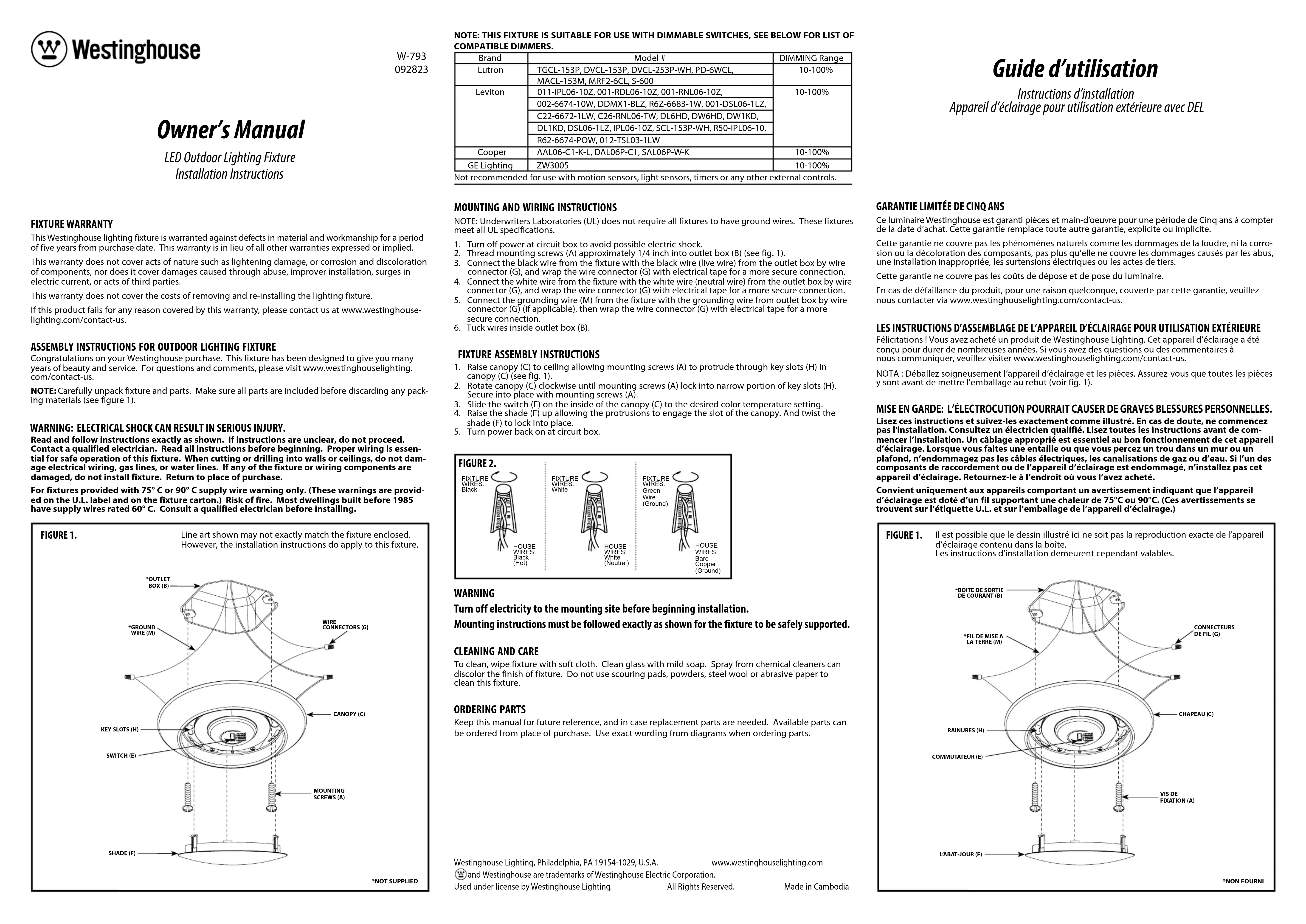 Ce luminaire Westinghouse est garanti pièces et main-d’oeuvre pour une période de Cinq ans à compter de la date d’achat. Cette garantie remplace toute autre garantie, explicite ou implicite. Cette garantie ne couvre pas les phénomènes naturels comme les dommages de la foudre, ni la corro- sion ou la décoloration des composants, pas plus qu’elle ne couvre les dommages causés par les abus, une installation inappropriée, les surtensions électriques ou les actes de tiers. Cette garantie ne couvre pas les coûts de dépose et de pose du luminaire.En cas de défaillance du produit, pour une raison quelconque, couverte par cette garantie, veuillez nous contacter via www.westinghouselighting.com/contact-us. MISE EN GARDE: L’ÉLECTROCUTION POURRAIT CAUSER DE GRAVES BLESSURES PERSONNELLES. Lisez ces instructions et suivez-les exactement comme illustré. En cas de doute, ne commencez pas l’installation. Consultez un électricien qualifié. Lisez toutes les instructions avant de com- mencer l’installation. Un câblage approprié est essentiel au bon fonctionnement de cet appareil d’éclairage. Lorsque vous faites une entaille ou que vous percez un trou dans un mur ou un plafond, n’endommagez pas les câbles électriques, les canalisations de gaz ou d’eau. Si l’un des composants de raccordement ou de l’appareil d’éclairage est endommagé, n’installez pas cet appareil d’éclairage. Retournez-le à l’endroit où vous l’avez acheté.Convient uniquement aux appareils comportant un avertissement indiquant que l’appareil d’éclairage est doté d’un fil supportant une chaleur de 75°C ou 90°C. (Ces avertissements se trouvent sur l’étiquette U.L. et sur l’emballage de l’appareil d’éclairage.)NOTE: THIS FIXTURE IS SUITABLE FOR USE WITH DIMMABLE SWITCHES, SEE BELOW FOR LIST OF COMPATIBLE DIMMERS. Brand Model # DIMMING Range Lutron TGCL-153P, DVCL-153P, DVCL-253P-WH, PD-6WCL, 10-100% MACL-153M, MRF2-6CL, S-600 Leviton 011-IPL06-10Z, 001-RDL06-10Z, 001-RNL06-10Z, 10-100% 002-6674-10W, DDMX1-BLZ, R6Z-6683-1W, 001-DSL06-1LZ, C22-6672-1LW, C26-RNL06-TW, DL6HD, DW6HD, DW1KD, DL1KD, DSL06-1LZ, IPL06-10Z, SCL-153P-WH, R50-IPL06-10, R62-6674-POW, 012-TSL03-1LW Cooper AAL06-C1-K-L, DAL06P-C1, SAL06P-W-K 10-100% GE Lighting ZW3005 10-100% Not recommended for use with motion sensors, light sensors, timers or any other external controls. *NOT SUPPLIED FIGURE 1. *OUTLET BOX (B) MOUNTING SCREWS (A) CANOPY (C) WIRE CONNECTORS (G) *GROUND WIRE (M) Line art shown may not exactly match the fixture enclosed. However, the installation instructions do apply to this fixture. KEY SLOTS (H) SHADE (F) SWITCH (E) Il est possible que le dessin illustré ici ne soit pas la reproduction exacte de l’appareil d’éclairage contenu dans la boîte.Les instructions d’installation demeurent cependant valables. *NON FOURNI FIGURE 1.