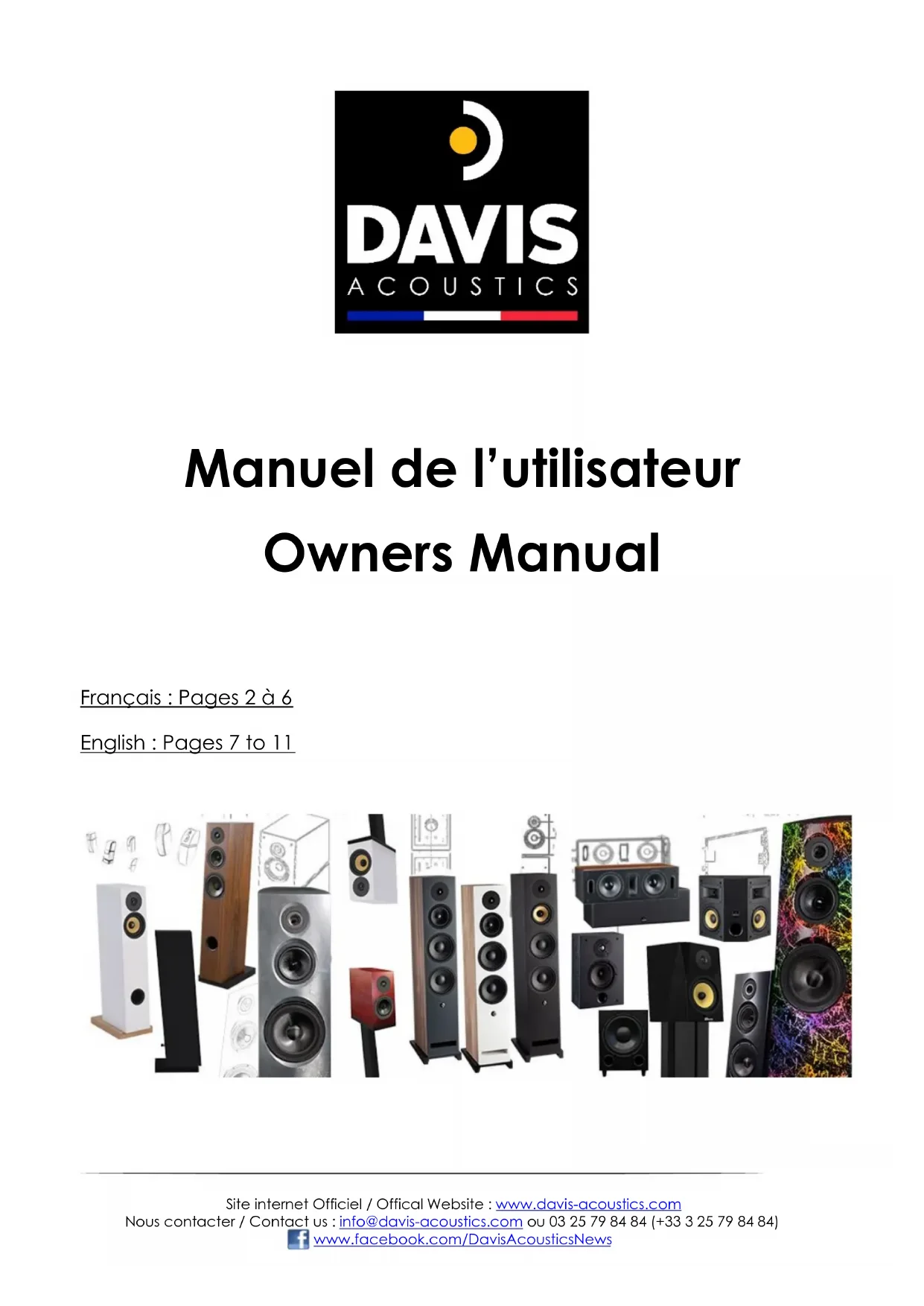 FRANÇAIS - FELICITATIONS ! Vous venez de choisir des enceintes DAVIS Acoustics, et nous vous remercions chaleureusement de votre choix. Vous allez enfin pouvoir écouter vos disques préférés dans les meilleures conditions possibles. Créé en 1986, DAVIS a mis tout son savoir-faire et toute son expertise dans l’étude et la conception de ce modèle. Une fabrication haut de gamme et des matériaux d’avant-garde font des enceintes DAVIS un produit d’exception qui va vous accompagner pendant de très nombreuses années. Ces performances très supérieures vous procureront beaucoup de plaisir, et devraient sublimer l’ensemble de vos écoutes. Afin de bénéficier pleinement du potentiel de vos enceintes, nous vous invitons à lire ces quelques pages. Il est important, en effet, de soigner leur installation en suivant nos instructions. Conservez précieusement ce feuillet pour éventuellement le relire lors d’une installation future. Si vous avez des questions supplémentaires concernant l’utilisation de vos enceintes DAVIS, vous pouvez également, à tout moment, contacter votre revendeur agréé. Le rodage … Dès le déballage, vos enceintes DAVIS sont capables d’offrir une écoute d’une réelle finesse. Néanmoins, les haut-parleurs qui la composent nécessitent un certain temps de rodage pour fonctionner parfaitement. Toutes les parties mécaniques des transducteurs vont s’assouplir avec le rodage, car l’écoute, qui peut paraître un peu « sèche » lors des premières écoutes, va s’améliorer au fil du temps, et de manière significative. Nous vous recommandons de brancher vos enceintes selon les recommandations qui vont suivre, et de les laisser fonctionner normalement (ni trop haut, ni trop bas volume). Le temps de rodage varie d’un modèle à l’autre, il est compris entre quelques heures et environ 150 heures. Merci d’en tenir rigueur avant toute écoute critique. Nettoyage des enceintes… Les enceintes DAVIS utilisent des coffrets à structure solide et durable. Cependant, nous vous recommandons de ne pas utiliser de produits abrasifs lors du nettoyage de vos enceintes. Appliquez un chiffon sec sur la surface du produit, à l’exception de la face avant qui est équipée des haut- parleurs. Pour celle-ci, appliquez simplement un plumeau pour la dépoussiérer, sans toucher les haut-parleurs. Si l’enceinte est tachée, vous pouvez utiliser un chiffon légèrement humide. Les produits laqués peuvent être traités au « polish », avec précaution.Manuel d’utilisation – Owners Manual