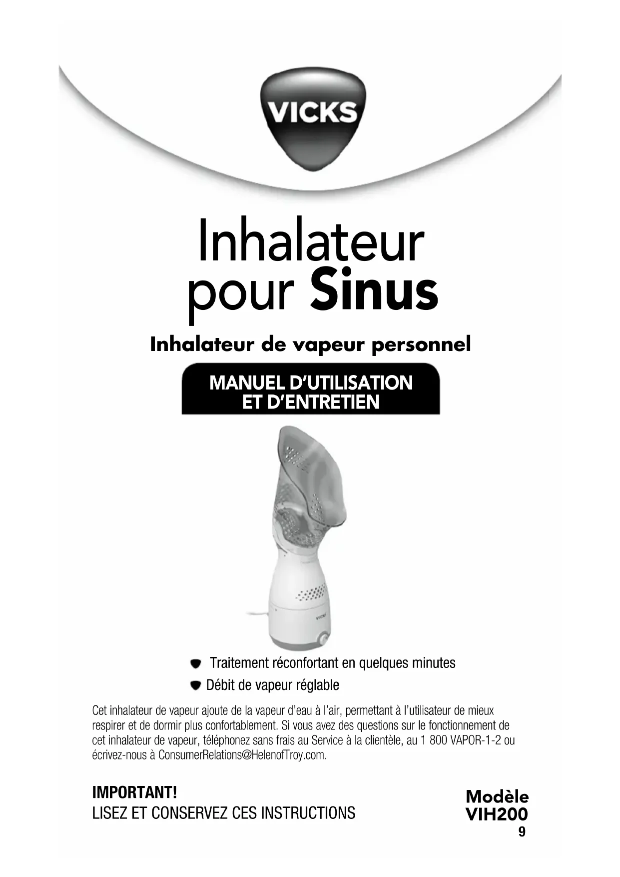 Cet inhalateur de vapeur ajoute de la vapeur d’eau à l’air, permettant à l’utilisateur de mieux respirer et de dormir plus confortablement. Si vous avez des questions sur le fonctionnement de cet inhalateur de vapeur, téléphonez sans frais au Service à la clientèle, au 1 800 VAPOR-1-2 ou écrivez-nous à ConsumerRelations@HelenofTroy.com. Traitement réconfortant en quelques minutesDébit de vapeur réglable IMPORTANT!