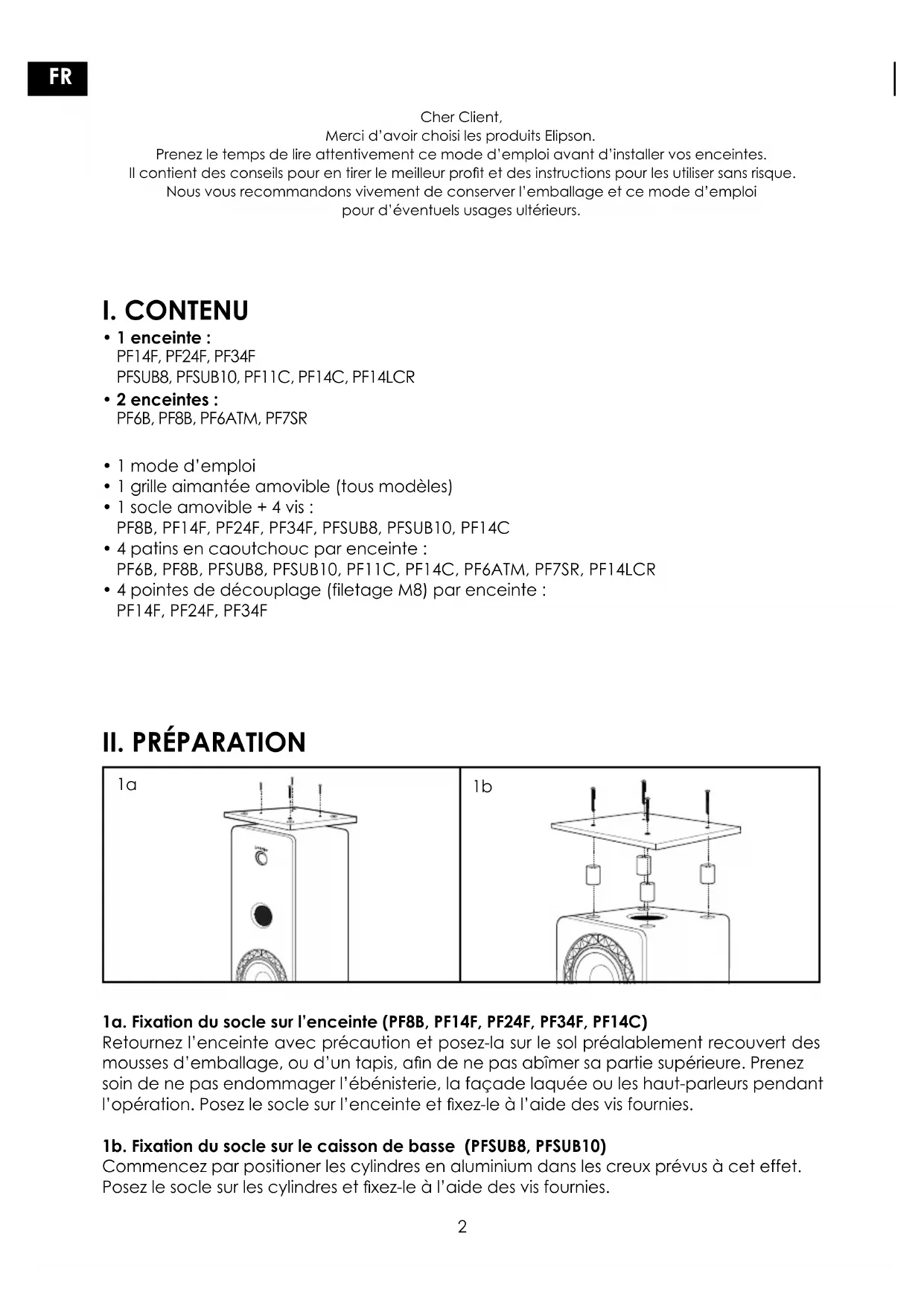 - 4 pointes de découplage (filetage M8) par enceinte : PF14F, PF24F, PF34F Cher Client, Merci d’avoir choisi les produits Elipson. Prenez le temps de lire attentivement ce mode d’emploi avant d’installer vos enceintes. Il contient des conseils pour en tirer le meilleur prot et des instructions pour les utiliser sans risque. Nous vous recommandons vivement de conserver l’emballage et ce mode d’emploi pour d’éventuels usages ultérieurs. 1a. Fixation du socle sur l’enceinte (PF8B, PF14F, PF24F, PF34F, PF14C) Retournez l’enceinte avec précaution et posez-la sur le sol préalablement recouvert des mousses d’emballage, ou d’un tapis, an de ne pas abîmer sa partie supérieure. Prenez soin de ne pas endommager l’ébénisterie, la façade laquée ou les haut-parleurs pendant l’opération. Posez le socle sur l’enceinte et xez-le à l’aide des vis fournies. 1b. Fixation du socle sur le caisson de basse (PFSUB8, PFSUB10) Commencez par positioner les cylindres en aluminium dans les creux prévus à cet effet. Posez le socle sur les cylindres et xez-le à l’aide des vis fournies.