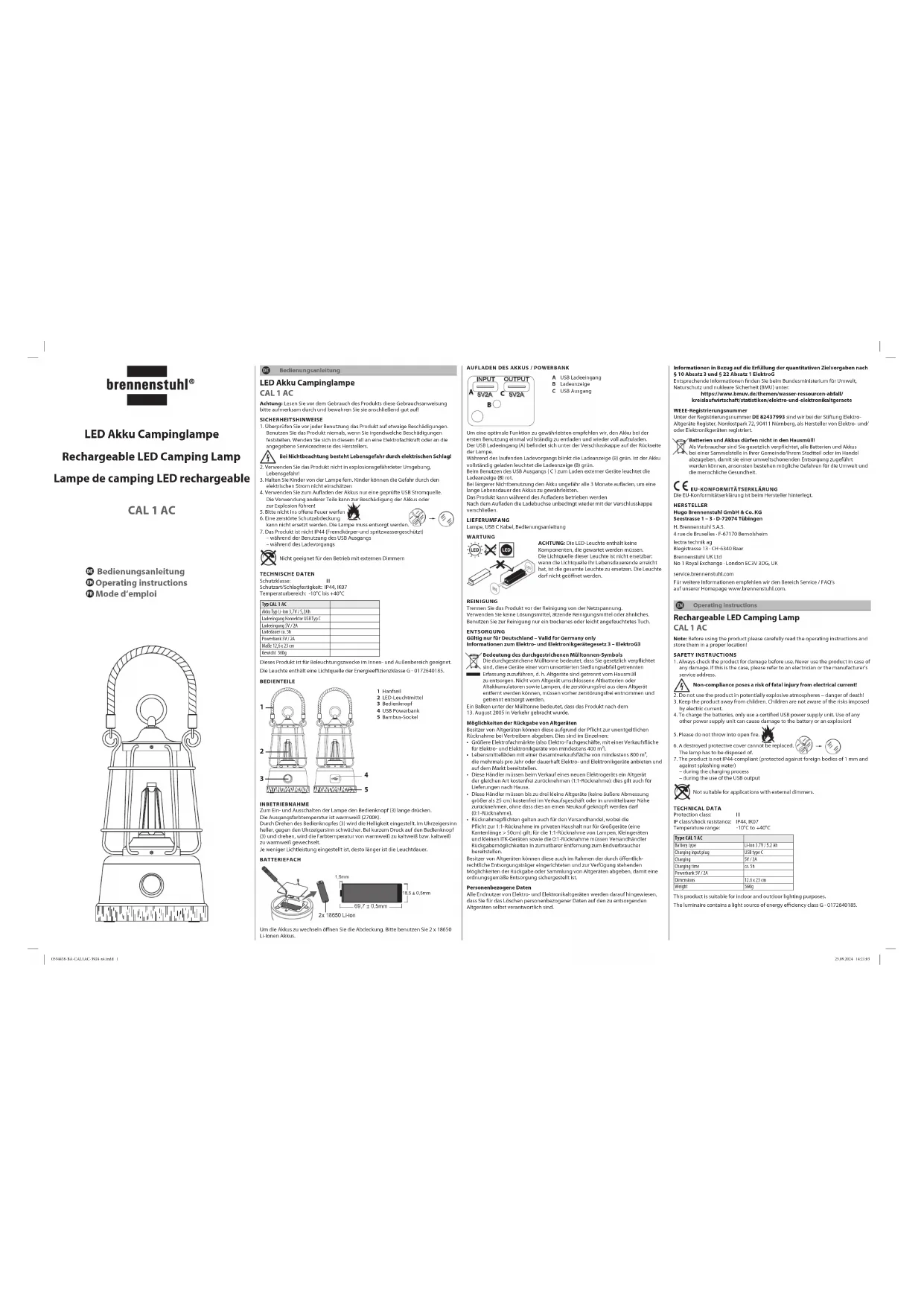 lampe. 3. Pendant le processus de chargement, le témoin de charge (B) clignote en vert. Lorsque la batterie est entièrement chargée, le témoin de charge (B) s’allume en vert. 4. Lorsque vous utilisez la sortie USB (C) pour recharger des appareils externes, le témoin de charge (B) s’allume en rouge. 5. Si le produit n’est pas utilisé pendant une longue période, chargez la batterie tous les 3 mois environ pour garantir une durée de vie plus longue de la batterie. 6. Le produit peut être utilisé pendant la charge.7. Après le rechargement, veillez à refermer la prise-chargeur avec le capuchon d’étanchéité.CONTENU DU COLISLampe, Câble USB C, Mode d’emploi1 Corde en chanvre2 Source lumineuse : LED3 Bouton interrupteur4 Prise-chargeur USB5 Socle en bambouMAINTENANCEATTENTION : le produit ne contient aucun composant nécessitant un entretien. La source lumineuse de ce produit n‘est pas remplaçable. Lorsque la source lumineuse a atteint la fin de sa durée de vie, remplacez l‘intégralité du produit. Le produit ne doit pas être ouvert.NETTOYAGEAvant tout nettoyage, débranchez le produit de la prise de courant.N’utilisez aucun solvant, produit de nettoyage abrasif ou autres produits similaires. Pour le nettoyage, utilisez uniquement un chiffon sec ou légèrement humide.MISE AU REBUT Les appareils électriques doivent être mis au rebut conformément aux normes environnementales ! Les appareils électriques ne doivent pas être mis dans les ordures ménagères ! Selon la directive européenne 2012/19/UE relative aux appareils électriques et électroniques usagés, les appareils électriques doivent être collectés séparément et recyclés de manière respectueuse de l’environnement. Pour connaître les solutions de mise au rebut d’un appareil usagé, adressez-vous à votre administration locale ou communale. Ne jetez pas les piles et batteries avec les ordures ménagères ! En tant que consommateur, vous êtes légalement tenu de déposer toutes les piles et batteries dans un point de collecte de votre commune/quartier ou dans le commerce, afin qu‘elles puissent être éliminées de manière écologique, faute de quoi elles peuvent constituer des dangers pour l‘environnement et la santé humaine. DÉCLARATION DE CONFORMITÉ UELa déclaration de conformité européenne est déposée chez le fabricant.FABRICANTHugo Brennenstuhl GmbH & Co. KG Seestrasse 1 – 3 · D-72074 TübingenH. Brennenstuhl S.A.S.4 rue de Bruxelles · F-67170 Bernolsheimlectra technik agBlegistrasse 13 · CH-6340 BaarBrennenstuhl UK LtdNo 1 Royal Exchange · London EC3V 3DG, UKservice.brennenstuhl.comPour plus d’informations, nous vous recommandons de consulter la rubrique Service/FAQ sur notre site Web www.brennenstuhl.com. 0534438-BA-CAL1AC-3924-x4.indd 2 0534438-BA-CAL1AC-3924-x4.indd 2