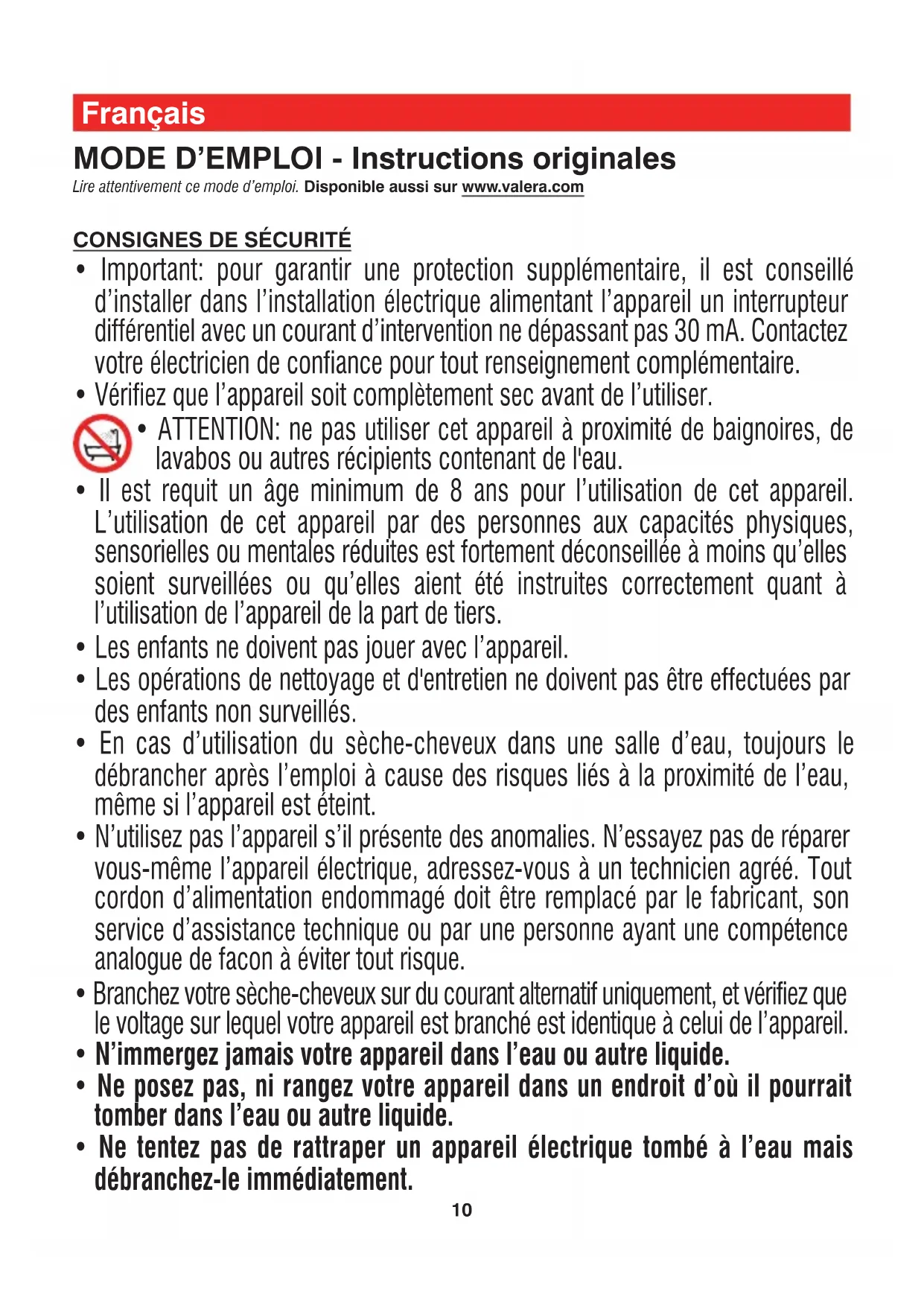 Débranchez toujours votre appareil avant de le nettoyer! Vous pouvez nettoyer l’appareil à l’aide d’un chiffon imbibé d’eau. Mais ne l’immergez ni dans l’eau ni dans tout autre liquide! Protégez votre appareil de la poussière. Si nécessaire, nettoyez la grille d’aération de celui-ci à l’aide d’une brosse ou d’un pinceau. ATTENTION: Il est formellement interdit de nettoyer les sèche- cheveux avec des liquides, des détergents, des solvants, de l'alcool et des produits chimiques. Sous réserve de modifications Guarantie VALERA garantit l’appareil que vous venez d’acheter aux conditions suivantes: