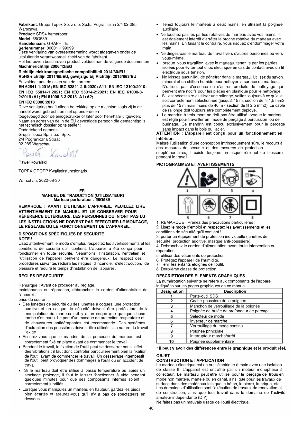Les produits fonctionnant à l'électricité ne doivent pas être jetés avec les déchets ménagers, mais doivent être apportés dans des installations appropriées pour être éliminés. Contactez le revendeur de votre produit ou les autorités locales pour obtenir des informations sur l'élimination. Les déchets d'équipements électriques et électroniques contiennent des substances inertes pour l'environnement. Les équipements qui ne sont pas recyclés présentent un risque potentiel pour l'environnement et la santé humaine. "Grupa Topex Spółka z ograniczoną odpowiedzialnością" Spółka komandytowa dont le siège social est situé à Varsovie, ul. Pograniczna 2/4 (ci-après : "Grupa Topex") informe que tous les droits d'auteur sur le contenu de ce manuel (ci-après : "Manuel"), y compris, entre autres. Son texte, ses photographies, ses diagrammes, ses dessins, ainsi que sa composition, appartiennent exclusivement à Grupa Topex et font l'objet d'une protection légale en vertu de la loi du 4 février 1994 sur le droit d'auteur et les droits connexes (ie Journal des lois 2006 n° 90 Poz. 631, tel que modifié). La copie, le traitement, la publication, la modification à des fins commerciales de l'ensemble du Manuel et de ses éléments individuels, sans le consentement de Grupa Topex exprimé par écrit, sont strictement interdits et peuvent entraîner une responsabilité civile et pénale. Déclaration de conformité CE Fabricant : Grupa Topex Sp. z o.o. Sp.k., Pograniczna 2/4 02-285 Warszawa Produit : Marteau perforateur SDS Modèle : 58G539 Nom commercial : GRAPHITE Numéro de série : 00001 ÷ 99999 Cette déclaration de conformité est délivrée sous la seule responsabilité du fabricant. Le produit décrit ci-dessus est conforme aux documents suivants : Directive sur les machines 2006/42/CE Directive sur la compatibilité électromagnétique 2014/30/EU Directive RoHS 2011/65/EU modifiée par la directive 2015/863/EU Et répond aux exigences des normes : EN 62841-1:2015 ; EN IEC 62841-2-6:2020+A11 ; EN ISO 12100:2010 ;42 EN IEC 55014-1:2021 ; EN IEC 55014-2:2021 ; EN IEC 61000-3- 2:2019+A1 ; EN 61000-3-3:2013+A1+A2 ; EN IEC 63000:2018 Cette déclaration concerne uniquement la machine telle qu'elle est mise sur le marché et n'inclut pas les composants. ajoutés par l'utilisateur final ou réalisés par lui ultérieurement. Nom et adresse de la personne résidente de l'UE autorisée à préparer le dossier technique : Signé au nom de : Grupa Topex Sp. z o.o. Sp.k. 2/4, rue Pograniczna 02-285 Varsovie Paweł Kowalski TOPEX GROUP Responsable de la qualité Varsovie, 2022-08-30