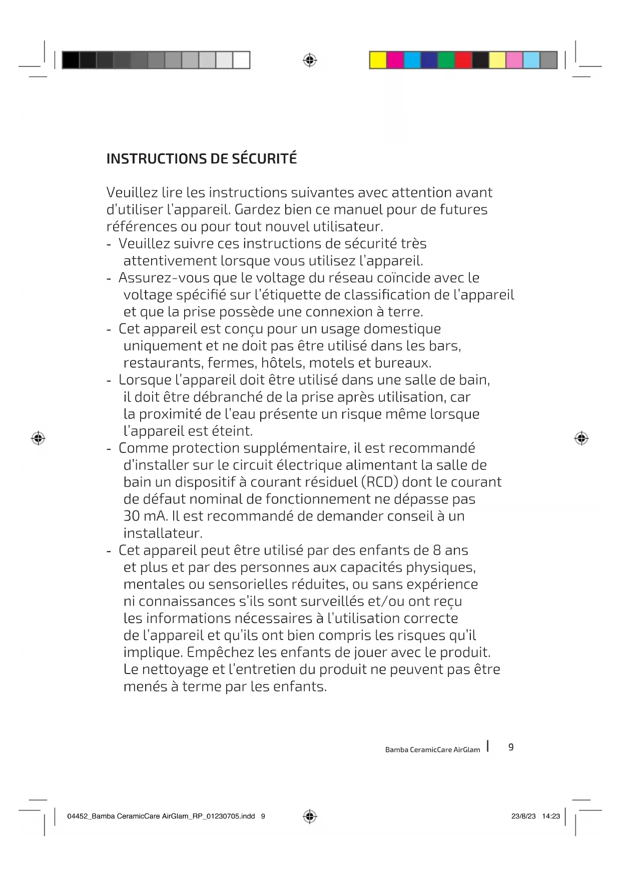 Ce symbole indique que, conformément à la réglementation en vigueur, le produit et/ou la batterie doivent être éliminés séparément des déchets municipaux. Lorsque ce produit atteint la n de sa vie utile, vous devez retirer les piles ou batteries et les apporter à un point de collecte désigné par les autorités locales. Pour obtenir des informations détaillées sur la manière la plus adéquate de vous défaire de vos appareils électriques et électroniques et/ou des batteries correspondantes, vous devez contacter les autorités locales. Le respect des directives susmentionnées contribuera à la protection de l’environnement. 04452_Bamba CeramicCare AirGlam_RP_01230705.indd 4104452_Bamba CeramicCare AirGlam_RP_01230705.indd 41 23/8/23 14:2323/8/23 14:2342 FRANÇAIS