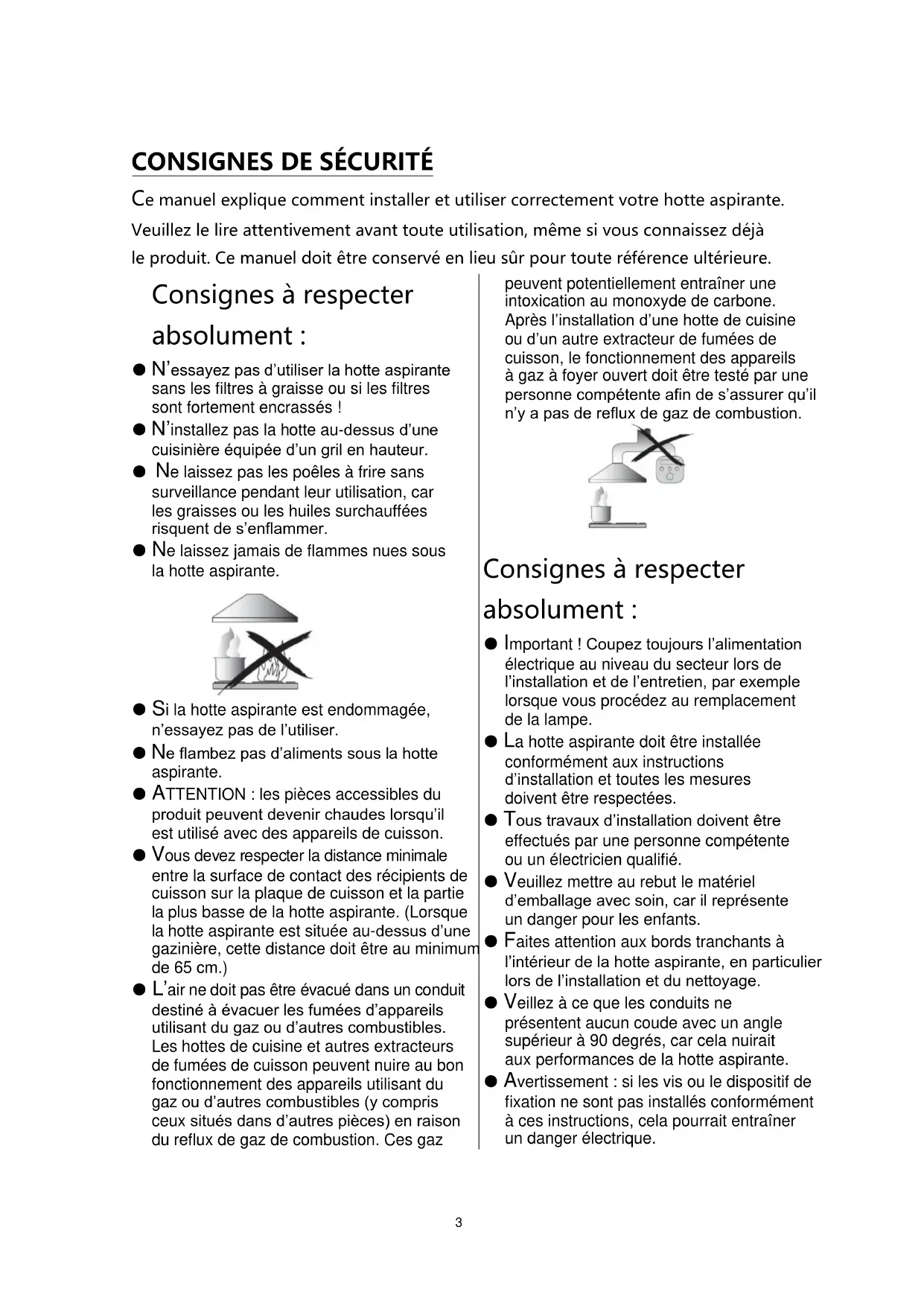 Ce manuel explique comment installer et utiliser correctement votre hotte aspirante. Veuillez le lire attentivement avant toute utilisation, même si vous connaissez déjà le produit. Ce manuel doit être conservé en lieu sûr pour toute référence ultérieure. Consignes à respecter absolument : ● N’essayez pas d’utiliser la hotte aspirante sans les filtres à graisse ou si les filtres sont fortement encrassés ! ● N’installez pas la hotte au-dessus d’une cuisinière équipée d’un gril en hauteur. ● Ne laissez pas les poêles à frire sans surveillance pendant leur utilisation, car les graisses ou les huiles surchauffées risquent de s’enflammer. ● Ne laissez jamais de flammes nues sous la hotte aspirante. ● Si la hotte aspirante est endommagée, n’essayez pas de l’utiliser. ● Ne flambez pas d’aliments sous la hotte aspirante. ● ATTENTION : les pièces accessibles du produit peuvent devenir chaudes lorsqu’il est utilisé avec des appareils de cuisson. ● Vous devez respecter la distance minimale entre la surface de contact des récipients de cuisson sur la plaque de cuisson et la partie la plus basse de la hotte aspirante. (Lorsque la hotte aspirante est située au-dessus d’une gazinière, cette distance doit être au minimum de 65 cm.) ● L’air ne doit pas être évacué dans un conduit destiné à évacuer les fumées d’appareils utilisant du gaz ou d’autres combustibles. Les hottes de cuisine et autres extracteurs de fumées de cuisson peuvent nuire au bon fonctionnement des appareils utilisant du gaz ou d’autres combustibles (y compris ceux situés dans d’autres pièces) en raison du reflux de gaz de combustion. Ces gaz peuvent potentiellement entraîner une intoxication au monoxyde de carbone. Après l’installation d’une hotte de cuisine ou d’un autre extracteur de fumées de cuisson, le fonctionnement des appareils à gaz à foyer ouvert doit être testé par une personne compétente afin de s’assurer qu’il n’y a pas de reflux de gaz de combustion. Consignes à respecter absolument : ● Important ! Coupez toujours l’alimentation électrique au niveau du secteur lors de l’installation et de l’entretien, par exemple lorsque vous procédez au remplacement de la lampe. ● La hotte aspirante doit être installée conformément aux instructions d’installation et toutes les mesures doivent être respectées. ● Tous travaux d’installation doivent être effectués par une personne compétente ou un électricien qualifié. ● Veuillez mettre au rebut le matériel d’emballage avec soin, car il représente un danger pour les enfants. ● Faites attention aux bords tranchants à l’intérieur de la hotte aspirante, en particulier lors de l’installation et du nettoyage. ● Veillez à ce que les conduits ne présentent aucun coude avec un angle supérieur à 90 degrés, car cela nuirait aux performances de la hotte aspirante. ● Avertissement : si les vis ou le dispositif de fixation ne sont pas installés conformément à ces instructions, cela pourrait entraîner un danger électrique. 31● Avertissement : avant d’accéder aux bornes, tous les circuits d’alimentation doivent être déconnectés. ● Si la tension nominale de la lampe est inférieure à la tension nominale de l’appareil, la tension nominale de la lampe doit également être indiquée sur la douille ou à proximité de celle-ci. Consignes à respecter absolument : ● Installez toujours des couvercles sur les casseroles et les poêles lorsque vous cuisinez sur une gazinière. ● En mode extraction, l’air de la pièce est évacué par la hotte aspirante. Veillez à ce que les mesures de ventilation appropriées soient respectées. La hotte aspirante élimine les odeurs de la pièce, mais pas la vapeur. ● La pièce doit être suffisamment ventilée lorsque la hotte aspirante est utilisée en même temps que des appareils utilisant du gaz ou d’autres combustibles. ● La hotte aspirante est destinée à un usage domestique uniquement.