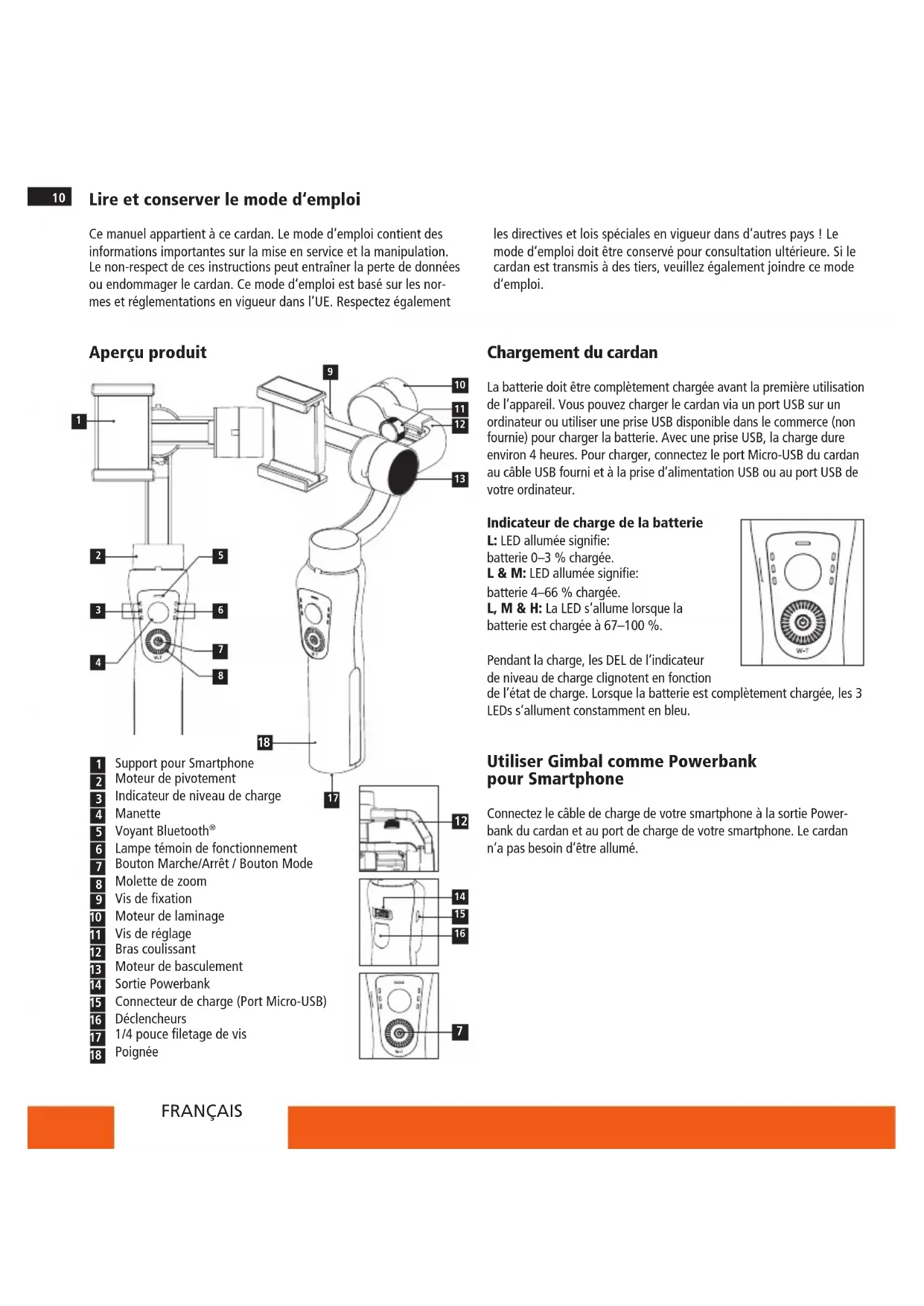 4 dBm Min. Standard Max. Entrée vol. 3,4 V 3,7 V 4,2 V Courant de service 150 mA 1500 mA 3000 mA Température de fonctionnement 0°C 40°C Durée de fonctionnement (Bien équilibré avec caméra montée) 12 heures Dimensions Env. 289x108x70 mm Poids Env. 450 g Angle d‘inclinaison 330° Plage d‘angle de roulis 160° Angle de pivotement 330° Modèles compatibles iPhone* 13 / Mini / Pro / Pro Max iPhone* 12 / Mini / Pro / Pro Max Samsung Galaxy S22 / + / Ultra Samsung Galaxy S21 / + / Ultra Huawei P50 Pro Huawei P40 / Lite / Pro et autres smartphones d‘une largeur de 53 à 88 mm (poids max. 280 g) Angle d‘inclinaison compatible -155° +155° Angle de rouleau compatible -30° +30° Angle de pivotement compatible -155° +155° Charge utile 280 g Durée de charge 4 heures Tension de charge 5 V Courant de charge 1 A Tension de sortie de la puissance 5 V Courant de sortie de la puissance 1 A Capacité de la batterie Batterie Li-Ion 4000 mAh Contenu de la livraison Cardan, Trépied, Câble Micro USB, Manuel d‘utilisation, Boucle14 FRANÇAIS