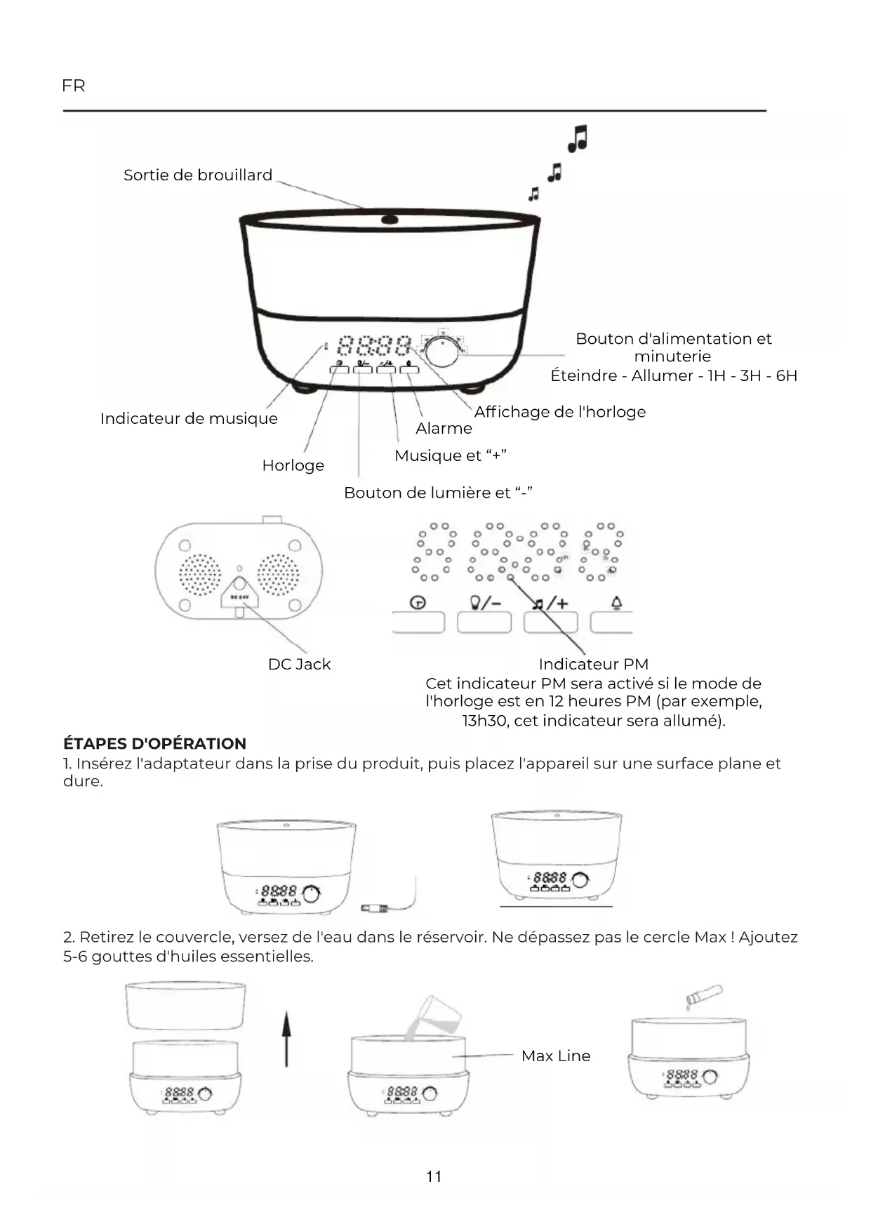 5-6 gouttes d'huiles essentielles. Indicateur de musique Horloge Bouton de lumière et “-” Musique et “+” Alarme Affichage de l'horloge Sortie de brouillard Bouton d'alimentation et minuterie Éteindre - Allumer - 1H - 3H - 6H DC Jack Indicateur PM Cet indicateur PM sera activé si le mode de l'horloge est en 12 heures PM (par exemple, 13h30, cet indicateur sera allumé). Max Line 11MODE D'EMPLOI