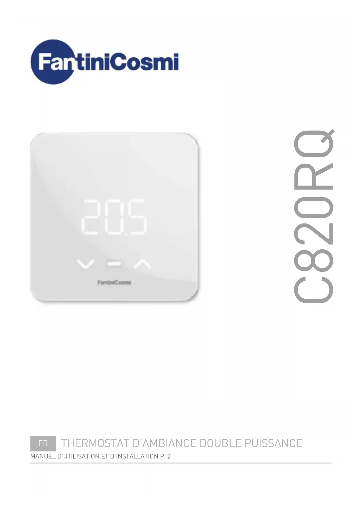 FRA Cher client, nous vous remercions d'avoir acheté le thermostat d'ambiance numérique Fantini Cosmi modèle C820RQ pour la gestion de la température et le confort domestique. Ce manuel contient toutes les informations nécessaires pour une installation et une configuration correctes. Vous pouvez également télécharger ce manuel au format numérique et en différentes langues en flashant le code QR ci-dessous et en saisissant le code du produit.