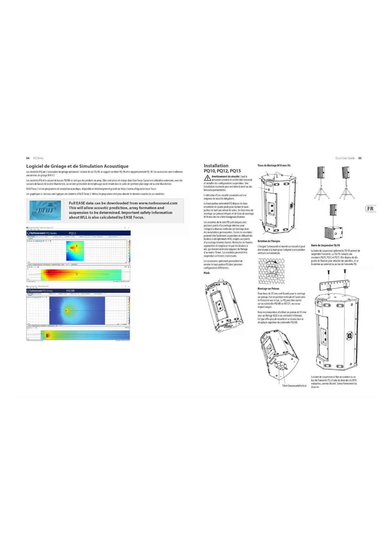Ajuste de retardo del altavoz PQ La distancia (tiempo) es la diferencia que se debe añadir al array volado para la alineación en el punto de escucha.48 PQ Series Quick Start Guide 49 Bienvenue Merci d'avoir choisi un produit de haut-parleur Turbosound pour votre application. Si vous souhaitez obtenir plus d'informations sur ce produit ou tout autre, veuillez visiter notre site web à l'adresse suivante : turbosound.com. Déballage du Haut-Parleur Après avoir déballé l'unité, veuillez vérier soigneusement s'il y a des dommages. Si des dommages sont constatés, veuillez en informer immédiatement votre fournisseur. Vous, le destinataire, devez initier toute réclamation. Veuillez conserver tous les emballages en cas de renvoi futur. À propos de ce Guide de Démarrage Rapide Ce guide de démarrage rapide (QSG) décrit les détails des haut-parleurs PQ10, PQ12, PQ15 et du caisson de basses PQ18B. Le QSG présente également diverses options telles que la barre de vol TQ-FB, le support en étrier PQ-YB, le support pivotant PQ-SB et le support de montage sur mât SA-35, prêts à être suspendus ou montés sur un mât. Ces instructions doivent être utilisées uniquement avec ces composants. Les composants de gréage optionnels (barre de vol TQ-FB, support en étrier PQ-YB, support pivotant PQ-SB et support de montage sur mât SA-35) ne doivent être utilisés qu'en conjonction avec les haut-parleurs Turbosound PQ, comme décrit dans ce guide de démarrage rapide. Les instructions ne présentent pas de détails concernant l'équipement de levage externe et ne contiennent pas de détails sur les procédures de levage ou d'installation sécuritaires. La possession de ces instructions et procédures n'implique pas une autorisation pour leur utilisation. Sécurité Générale Le fonctionnement de votre produit dans le cadre d'un système suspendu, s'il est installé de manière incorrecte, peut exposer les personnes à des risques graves pour la santé, voire à la mort. De plus, veuillez vous assurer que les aspects électriques, mécaniques et acoustiques sont discutés avec un personnel qualié et certié (par les autorités locales, régionales ou nationales) avant toute installation. L'installation et la conguration doivent être eectuées uniquement par un personnel qualié et autorisé, en respectant les réglementations de sécurité locales, régionales et autres en vigueur dans votre pays. Si des pièces ou des composants manquent, veuillez contacter votre revendeur avant de tenter de congurer le système. Il est de la responsabilité de la personne installant l'ensemble de s'assurer que les points de suspension/xation sont adaptés à l'usage prévu. Nous vous recommandons également de programmer une formation Turbosound avec nos partenaires commerciaux et notre équipe d'applications. Les équipements utilisés pour se connecter au système de gréage Turbosound doivent être correctement évalués et conformes aux réglementations de sécurité locales, régionales et autres. N'utilisez pas le gréage Turbosound avec d'autres types ou marques de haut-parleurs. Cette pratique pourrait compromettre les normes de sécurité et Music Tribe Global Brands Ltd ne sera pas responsable des dommages ou des blessures ainsi causés. Ne modiez pas les accessoires ni ne les utilisez d'une manière autre que celle décrite dans ce QSG. Les composants de gréage fournis dans le cadre d'un ensemble complet sont non interchangeables et ne doivent pas être échangés avec les pièces de composants d'un autre ensemble. La soudure ou tout autre moyen de xation permanente des composants de gréage entre eux ou aux points de xation du caisson ne sont pas autorisés. Les composants ou ensembles de gréage doivent être xés uniquement aux caissons de haut-parleurs Turbosound en utilisant les points de xation du caisson. Music Tribe Global Brands Ltd décline toute responsabilité en cas de dommage ou de blessure personnelle résultant d'une utilisation, d'une installation ou d'un fonctionnement incorrect du produit. Des contrôles réguliers doivent être eectués par du personnel qualié pour s'assurer que le système reste dans un état sécurisé et stable. Assurez-vous que, lorsque le produit est suspendu, la zone située en dessous du produit est exempte de trac humain. Ne suspendez pas le produit dans des zones où le public pourrait circuler ou accéder. Référez-vous toujours aux indications d'erreur et d'avertissement du logiciel de modélisation EASE Focus 3 avant l'installation. Sécurités Secondaires Tous les haut-parleurs suspendus dans les théâtres, studios ou autres lieux de travail et de divertissement doivent, en plus du moyen principal de suspension, être équipés d'une sécurité secondaire indépendante, correctement évaluée et solidement attachée. Seules des cordes en acier ou des chaînes en acier de construction et de capacité approuvées doivent être utilisées comme sécurités secondaires. Les cordes en acier recouvertes de plastique ne sont pas autorisées en tant que sécurités secondaires. La suspension de sécurité secondaire doit être indépendante des points de suspension principaux et capable de supporter le poids total du système. Le dispositif de sécurité supplémentaire doit être monté de manière à ce que le haut-parleur soit retenu par le dispositif de sécurité sans aucune chute ni balancement, en cas de défaillance de la suspension principale. Sécurité Opérationnelle Les procédures nécessitent l'utilisation de deux personnes autorisées ou plus. Élaborez un plan de levage : avant toute levée, vous devez formuler un plan qui décrit les étapes et procédures exactes à suivre. Le plan doit être partagé avec tous les assistants et parties prenantes dans l'opération de levage, an que chacun comprenne ses responsabilités. Suivez toutes les instructions données sur les étiquettes d'instructions respectives des composants de gré