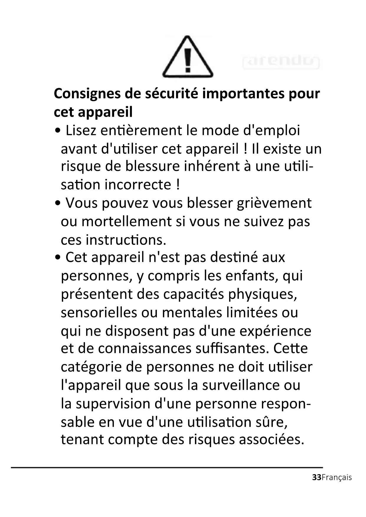 - Lisez enèrement le mode d'emploi avant d'uliser cet appareil ! Il existe un risque de blessure inhérent à une uli- saon incorrecte !