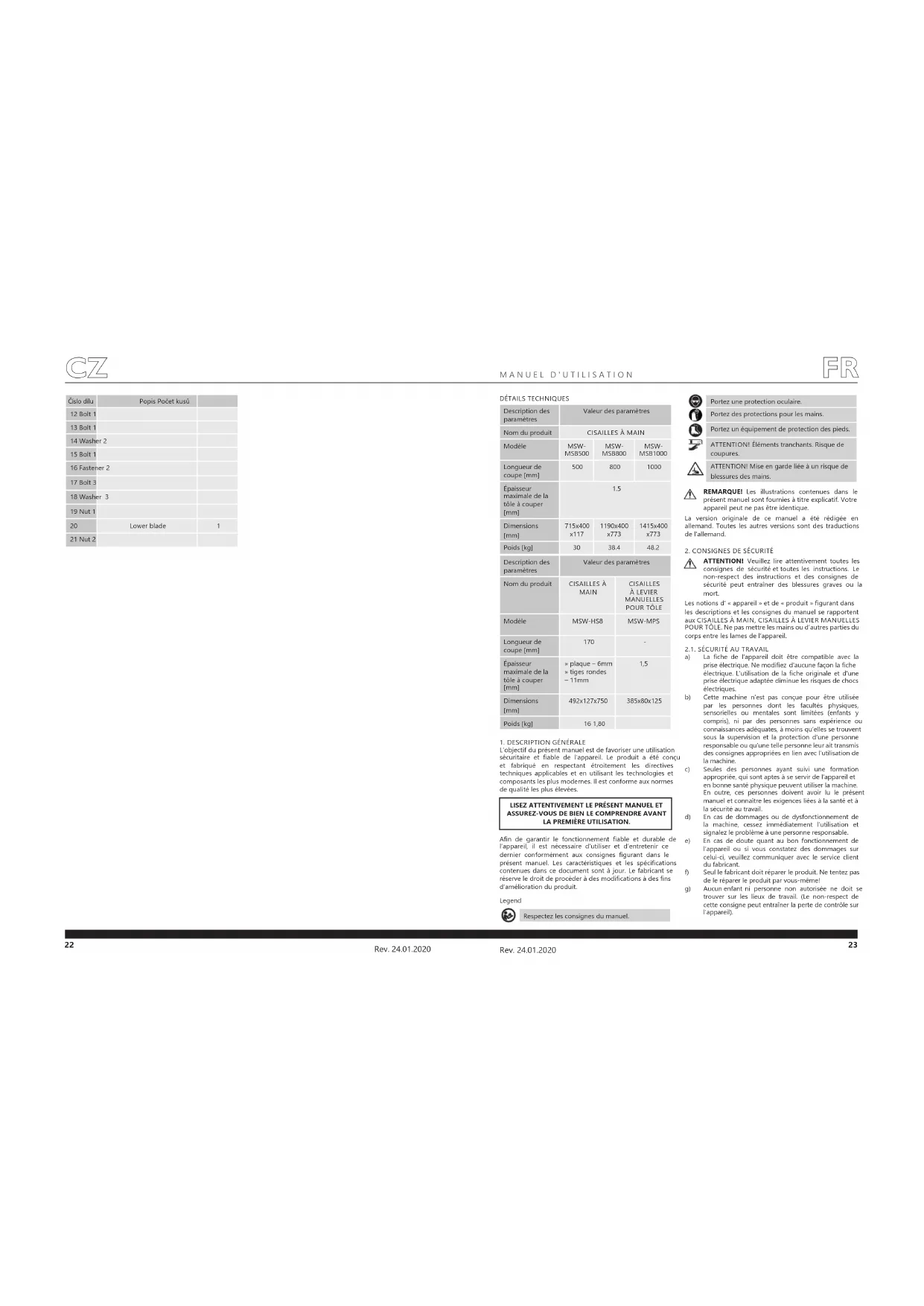 Rev. 24.01.2020 Rev. 24.01.2020 An de garantir le fonctionnement able et durable de l’appareil, il est nécessaire d’utiliser et d’entretenir ce dernier conformément aux consignes gurant dans le présent manuel. Les caractéristiques et les spécications contenues dans ce document sont à jour. Le fabricant se réserve le droit de procéder à des modications à des ns d’amélioration du produit. Legend Portez une protection oculaire. Portez des protections pour les mains. Portez un équipement de protection des pieds. ATTENTION! Éléments tranchants. Risque de coupures. ATTENTION! Mise en garde liée à un risque de blessures des mains. Číslo dílu Popis Počet kusů 12 Bolt 1 13 Bolt 1 14 Washer 2 15 Bolt 1 16 Fastener 2 17 Bolt 3 18 Washer 3 19 Nut 1 20 Lower blade 1 21 Nut 2 Description des paramètres Valeur des paramètres Nom du produit CISAILLES À MAIN Modèle MSW- MSB500 MSW- MSB800 MSW- MSB1000 Longueur de coupe [mm]