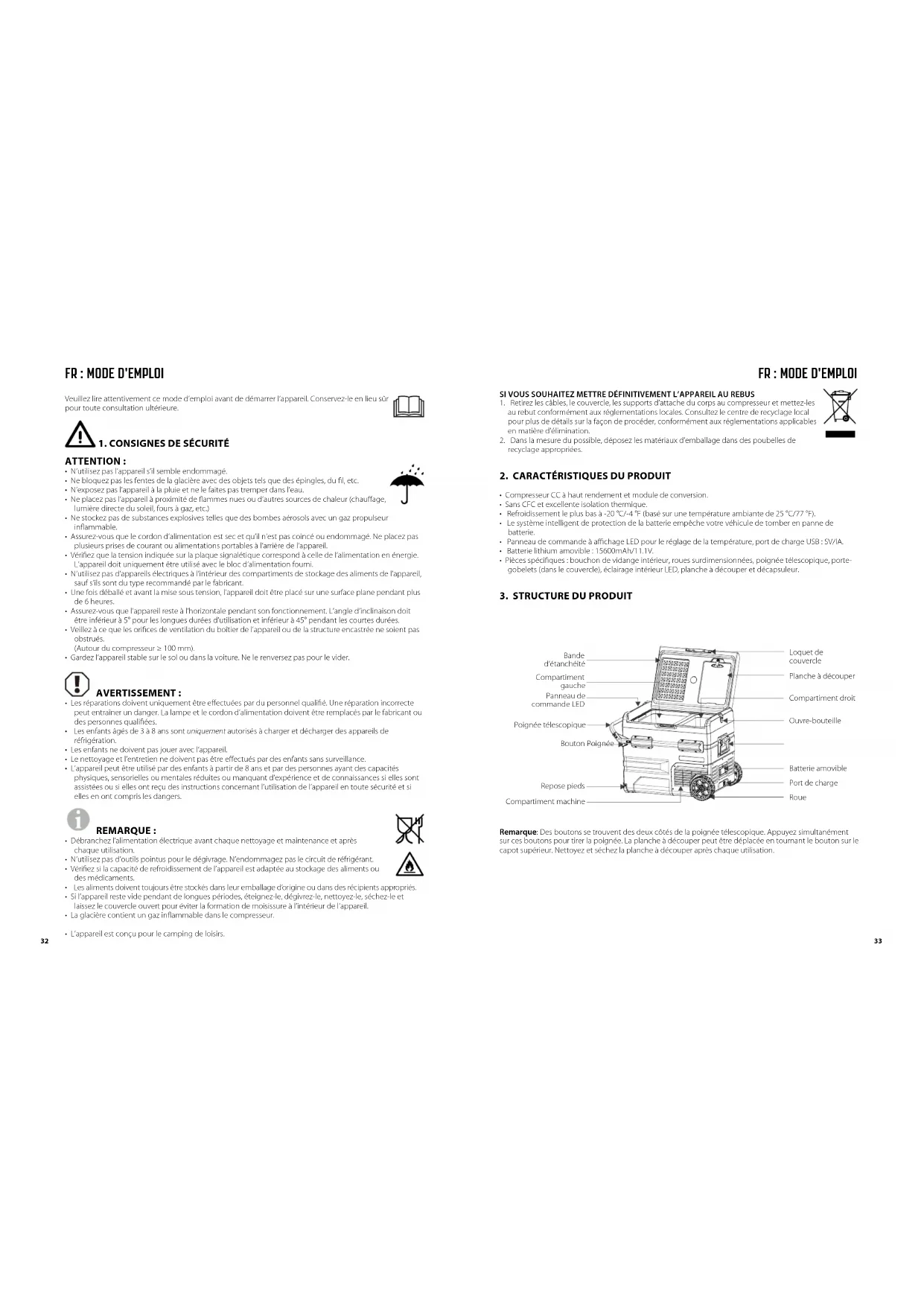 - Pièces spécifiques : bouchon de vidange intérieur, roues surdimensionnées, poignée télescopique, porte- gobelets (dans le couvercle), éclairage intérieur LED, planche à découper et décapsuleur.