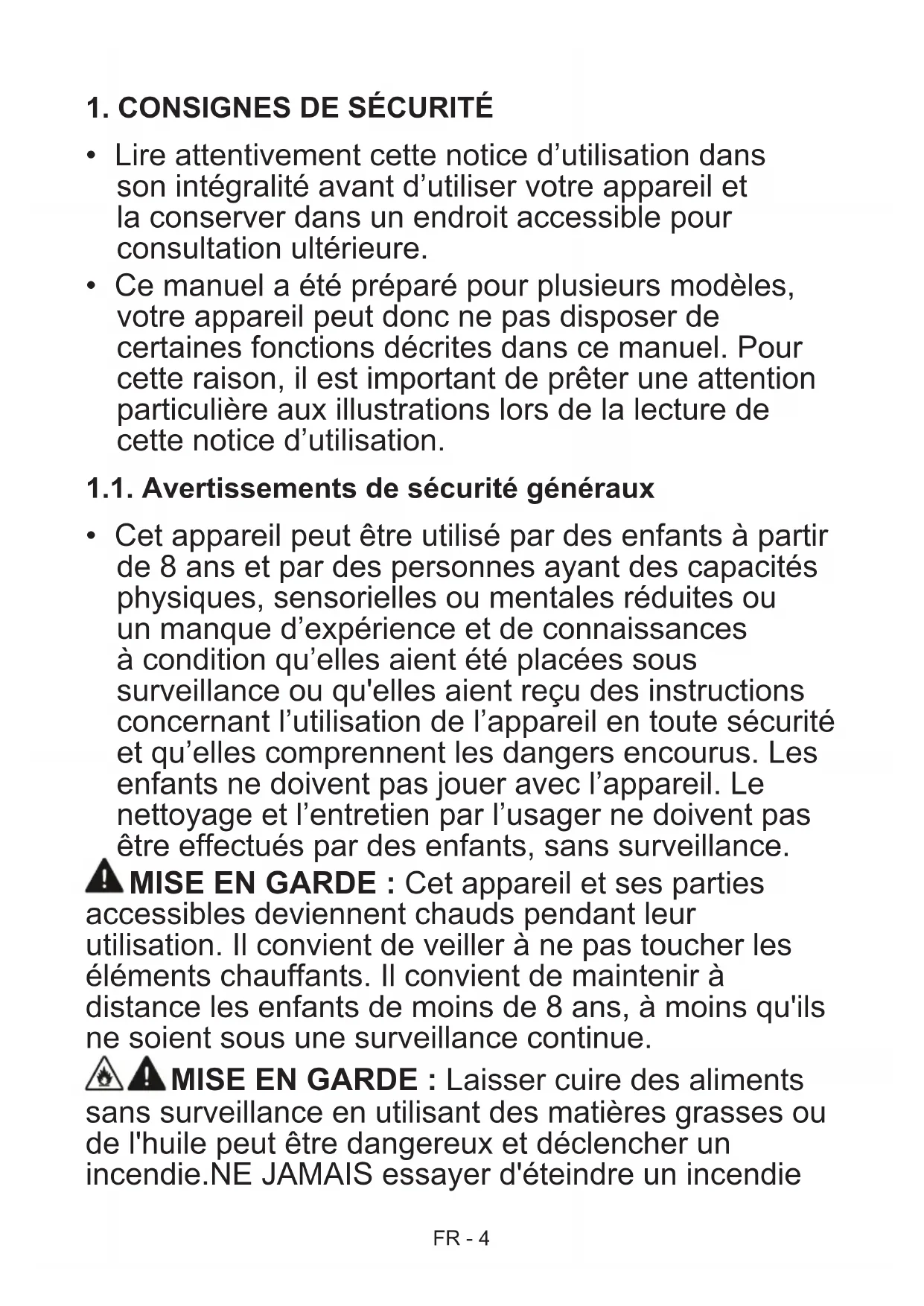 - Cet appareil peut être utilisé par des enfants à partir de 8 ans et par des personnes ayant des capacités physiques, sensorielles ou mentales réduites ou un manque d’expérience et de connaissances à condition qu’elles aient été placées sous surveillance ou qu'elles aient reçu des instructions concernant l’utilisation de l’appareil en toute sécurité et qu’elles comprennent les dangers encourus. Les enfants ne doivent pas jouer avec l’appareil. Le nettoyage et l’entretien par l’usager ne doivent pas être effectués par des enfants, sans surveillance. MISE EN GARDE : Cet appareil et ses parties accessibles deviennent chauds pendant leur utilisation. Il convient de veiller à ne pas toucher les éléments chauffants. Il convient de maintenir à distance les enfants de moins de 8 ans, à moins qu'ils ne soient sous une surveillance continue. MISE EN GARDE : Laisser cuire des aliments sans surveillance en utilisant des matières grasses ou de l'huile peut être dangereux et déclencher un incendie.NE JAMAIS essayer d'éteindre un incendieFR - 5 avec de l'eau, mais arrêter l'appareil puis couvrir les flammes par exemple avec un couvercle ou une couverture anti-feu. MISE EN GARDE : Risque d'incendie: ne pas entreposer d'objets sur les surfaces de cuisson.