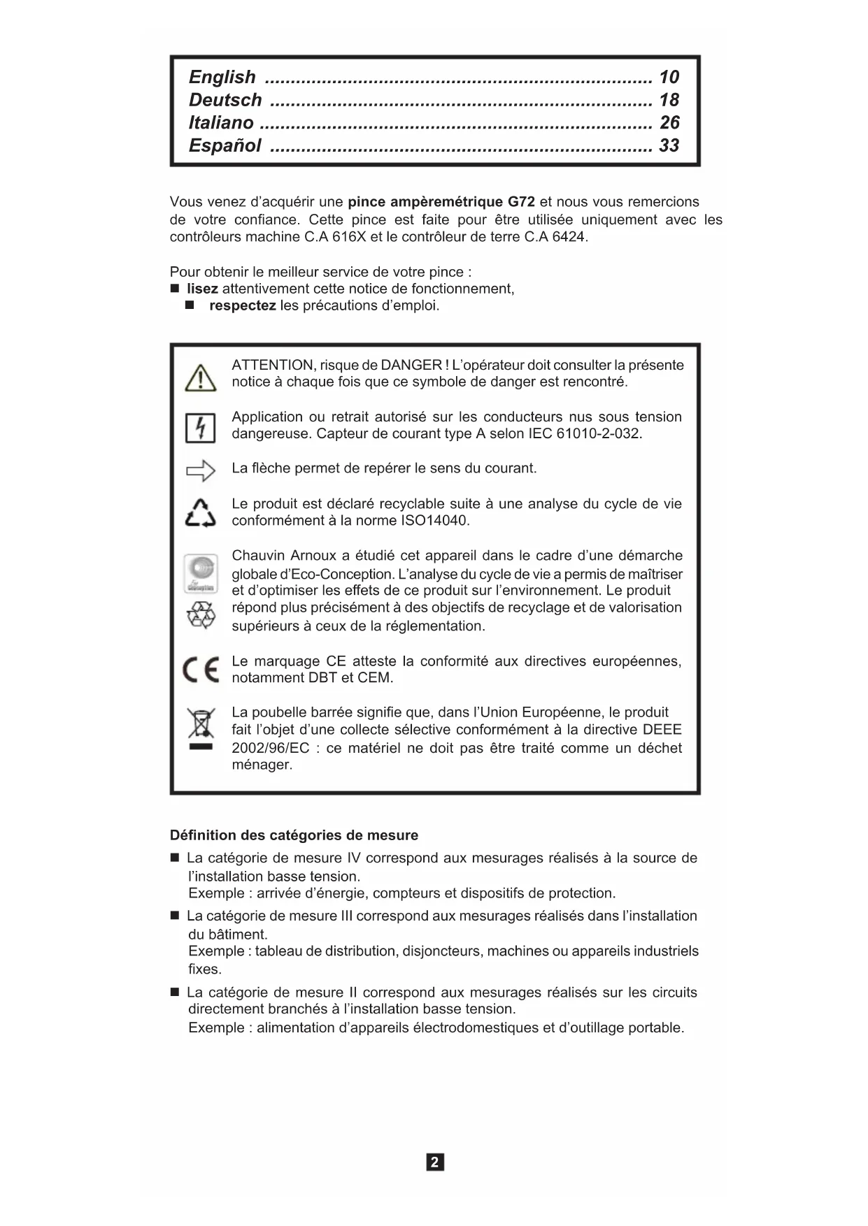 - Español Vous venez d’acquérir une pince ampèremétrique G72 et nous vous remercions de votre conance. Cette pince est faite pour être utilisée uniquement avec les contrôleurs machine C.A 616X et le contrôleur de terre C.A 6424. Pour obtenir le meilleur service de votre pince : lisez attentivement cette notice de fonctionnement, respectez les précautions d’emploi.3 p. 33