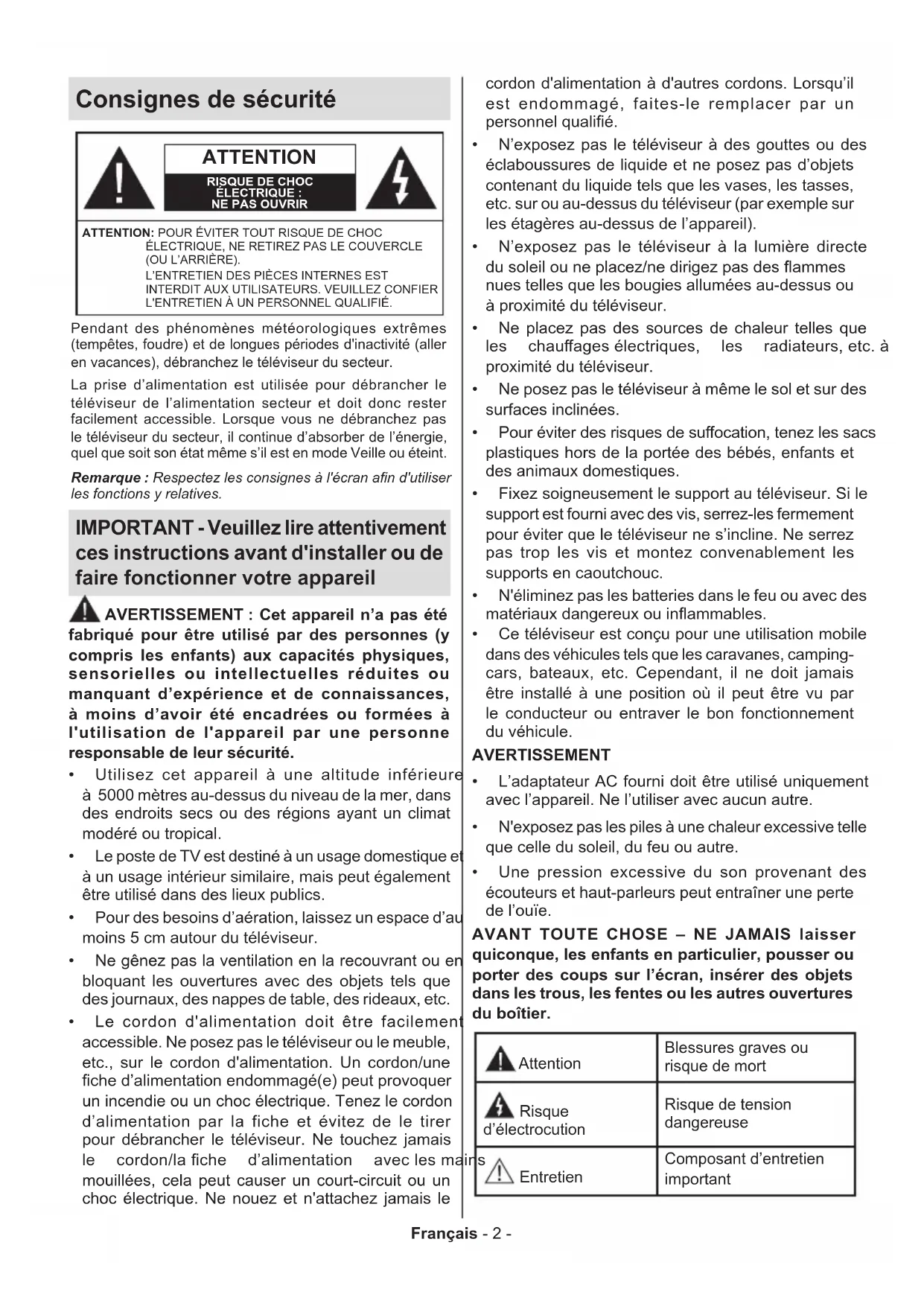 - Informations de la disposition Français - 2 - Consignes de sécurité ATTENTION RISQUE DE CHOC ÉLECTRIQUE :NE PAS OUVRIRATTENTION: POUR ÉVITER TOUT RISQUE DE CHOC ÉLECTRIQUE, NE RETIREZ PAS LE COUVERCLE (OU L’ARRIÈRE). L’ENTRETIEN DES PIÈCES INTERNES EST INTERDIT AUX UTILISATEURS. VEUILLEZ CONFIER L'ENTRETIEN À UN PERSONNEL QUALIFIÉ.Remarque : Respectez les consignes à l'écran an d'utiliser les fonctions y relatives.Pendant des phénomènes météorologiques extrêmes (tempêtes, foudre) et de longues périodes d'inactivité (aller en vacances), débranchez le téléviseur du secteur.La prise d’alimentation est utilisée pour débrancher le téléviseur de l’alimentation secteur et doit donc rester facilement accessible. Lorsque vous ne débranchez pas le téléviseur du secteur, il continue d’absorber de l’énergie, quel que soit son état même s’il est en mode Veille ou éteint. IMPORTANT - Veuillez lire attentivement ces instructions avant d'installer ou de faire fonctionner votre appareil p. 39