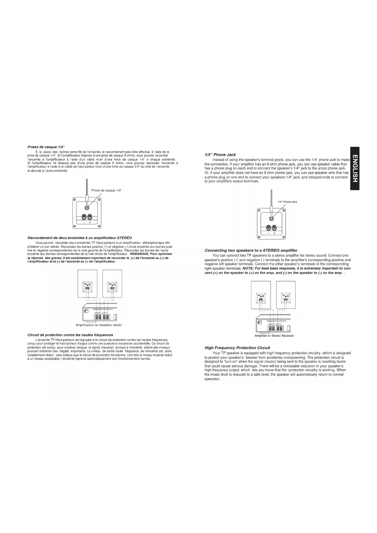 225 Watts RMS/450 Watts Peak PowerFrequency Response: 30Hz-22kHz4 OhmTP212225 Watts RMS/450 Watts Peak PowerFrequency Response: 30Hz-22kHz4 OhmTP212SPEAKER OUTPUTS-RIGHT+ -LEFT+ High Frequency Protection Circuit Your TP speaker is equipped with high frequency protection circuitry, which is designed to protect your speaker’s tweeter from accidental overpowering. The protection circuit is designed to “turn on” when the signal (music) being sent to the speaker is reaching levels that could cause serious damage. There will be a noticeable reduction in your speaker’s high frequency output, which lets you know that the protection circuitry is working. When the music level is reduced to a safe level, the speaker will automatically return to normal operation. Prises de casque 1/4” À la place des bornes serre-fils de l’enceinte, le raccordement peut être effectué à l’aide de la prise de casque 1/4”. Si l’amplificateur dispose d’une prise de casque 8 ohms, vous pouvez raccorder l’enceinte à l’amplificateur à l’aide d’un câble muni d’une fiche de casque 1/4” à chaque extrémité. Si l’amplificateur ne dispose pas d’une prise de casque 8 ohms, vous pouvez raccorder l’enceinte à l’amplificateur à l’aide d’un câble de haut-parleur muni d’une fiche de casque 1/4” du côté de l’enceinte et dénudé à l’autre extrémité. Raccordement de deux enceintes à un amplificateur STÉRÉO Vous pouvez raccorder deux enceintes TP Haut-parleurs à un amplificateur stéréophonique afin d’obtenir un son stéréo. Raccordez les bornes positive (+) et négative (-) d’une enceinte aux bornes posi