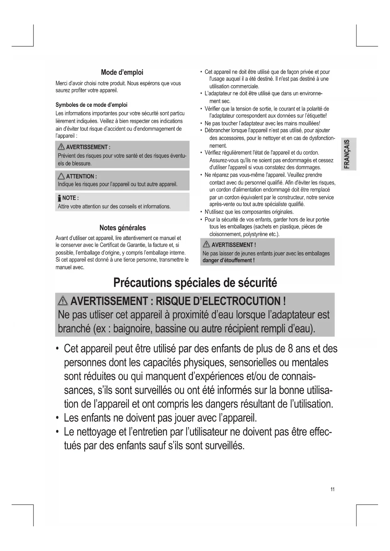 Ne pas utliser cet appareil à proximité d’eau lorsque l’adaptateur est branché (ex : baignoire, bassine ou autre récipient rempli d’eau).