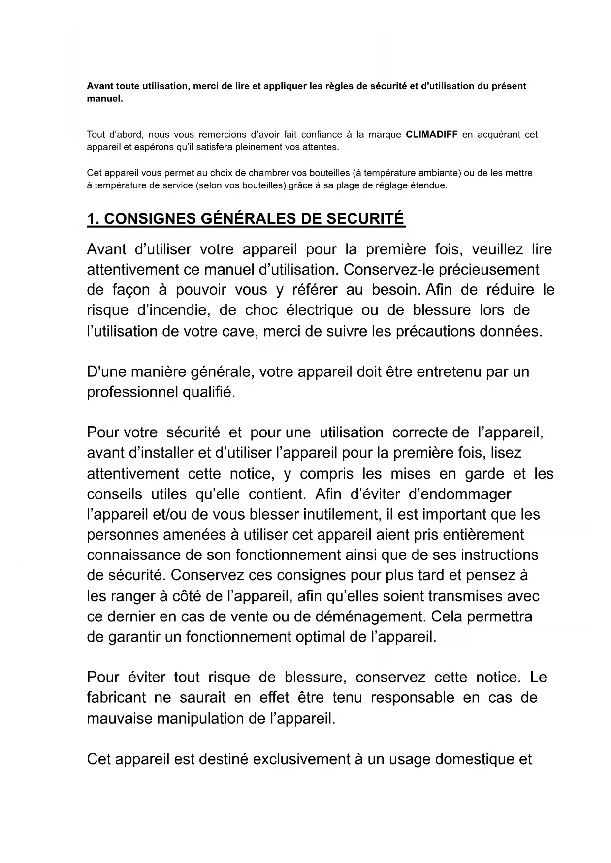 Avant toute utilisation, merci de lire et appliquer les règles de sécurité et d'utilisation du présent manuel. Tout d’abord, nous vous remercions d’avoir fait confiance à la marque CLIMADIFF en acquérant cet appareil et espérons qu’il satisfera pleinement vos attentes. Cet appareil vous permet au choix de chambrer vos bouteilles (à température ambiante) ou de les mettre à température de service (selon vos bouteilles) grâce à sa plage de réglage étendue.