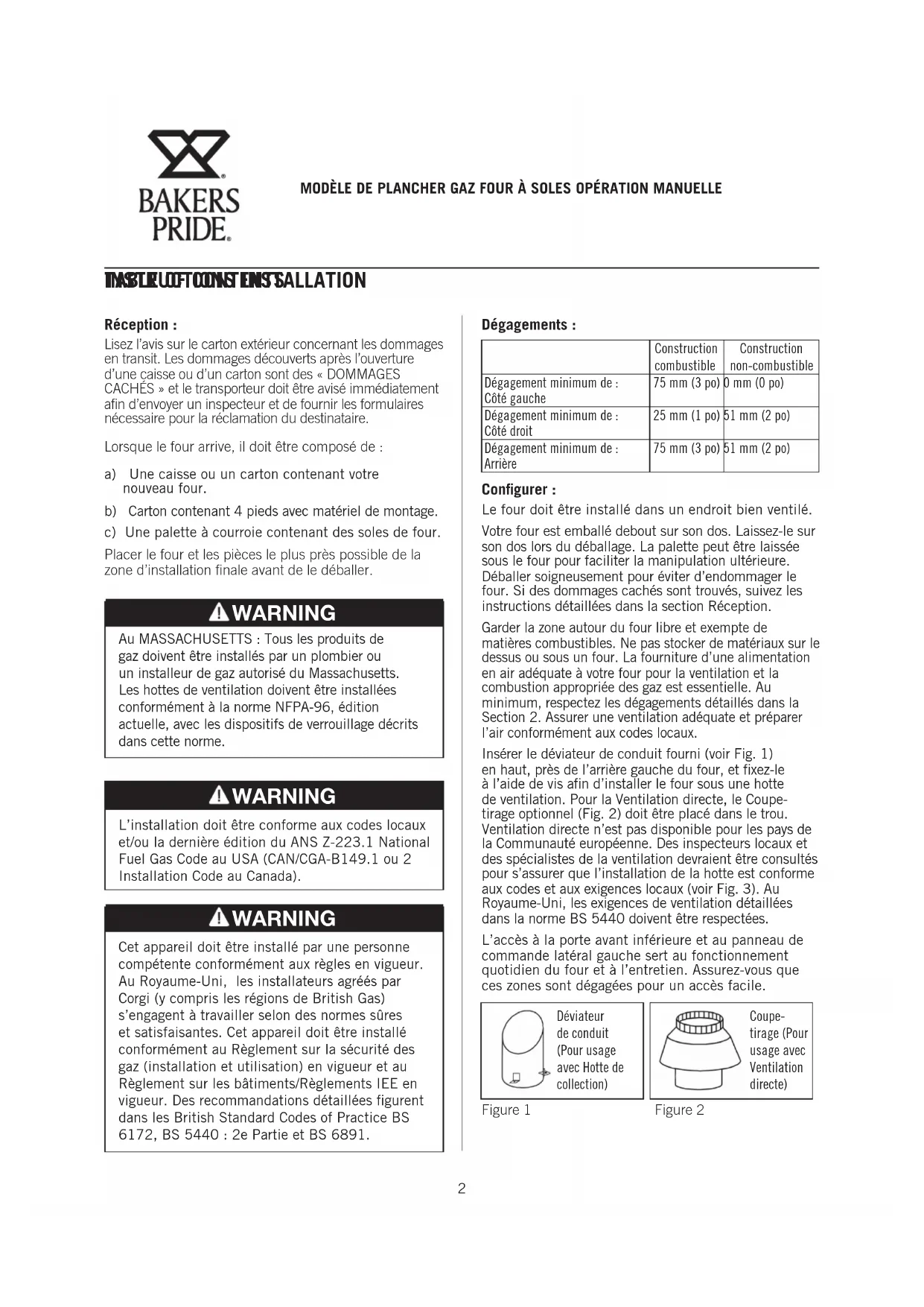 l’air conformément aux codes locaux. Insérer le déviateur de conduit fourni (voir Fig. 1) en haut, près de l’arrière gauche du four, et fixez-le à l’aide de vis afin d’installer le four sous une hotte de ventilation. Pour la Ventilation directe, le Coupe- tirage optionnel (Fig. 2) doit être placé dans le trou. Ventilation directe n’est pas disponible pour les pays de la Communauté européenne. Des inspecteurs locaux et des spécialistes de la ventilation devraient être consultés pour s’assurer que l’installation de la hotte est conforme aux codes et aux exigences locaux (voir Fig. 3). Au Royaume-Uni, les exigences de ventilation détaillées dans la norme BS 5440 doivent être respectées. L’accès à la porte avant inférieure et au panneau de commande latéral gauche sert au fonctionnement quotidien du four et à l’entretien. Assurez-vous que ces zones sont dégagées pour un accès facile. Déviateur de conduit (Pour usage avec Hotte de collection) Figure 1 Coupe- tirage (Pour usage avec Ventilation directe) Figure 2 INSTRUCTIONS INSTALLATION MODÈLE DE PLANCHER GAZ FOUR À SOLES OPÉRATION MANUELLEFLOOR MODEL GAS DECK OVEN OPERATION MANUAL