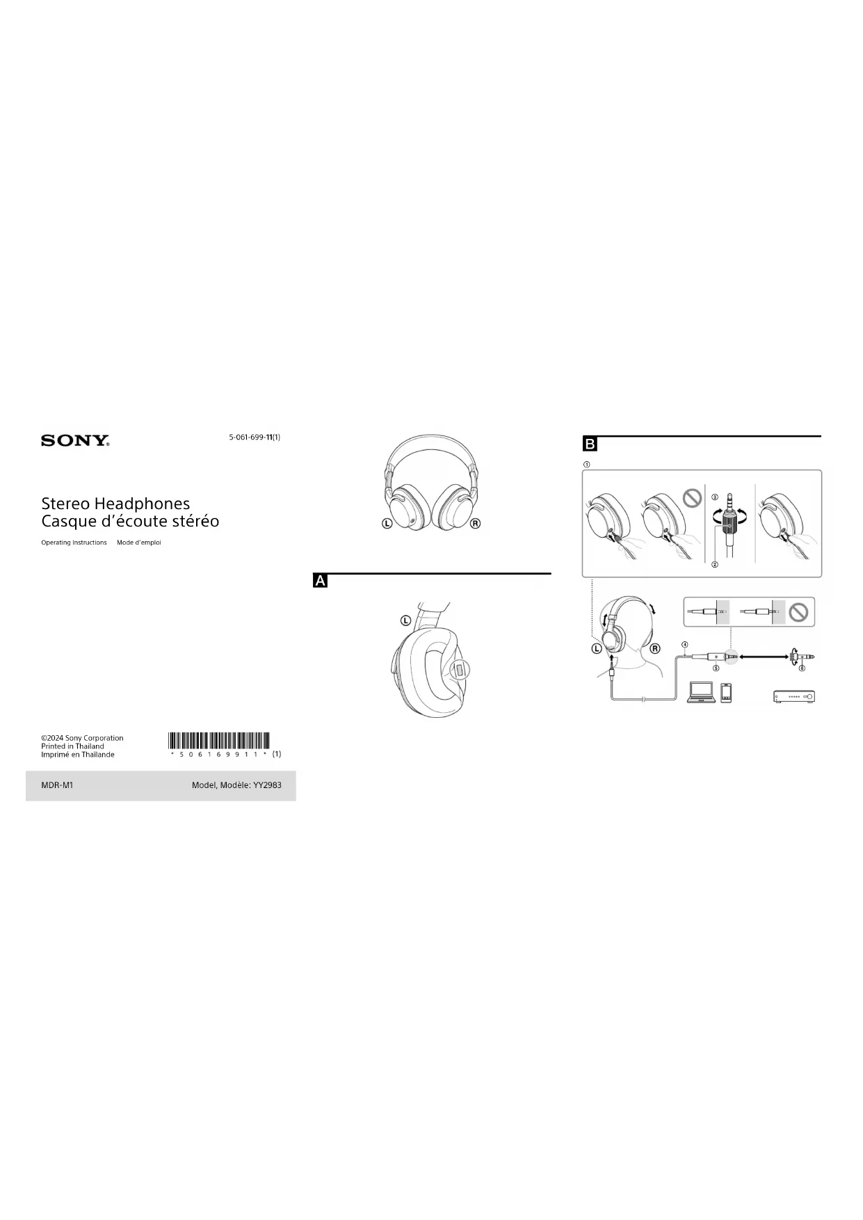 MDR-M1 Stereo Headphones Casque d’écoute stéréo Operating Instructions Mode d’emploi ©2024 Sony Corporation Printed in Thailand Imprimé en Thaïlande 5-061-699-11(1) Model, Modèle: YY2983