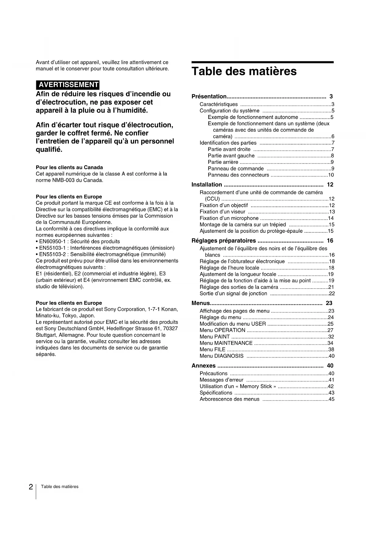 - EN55103-2 : Sensibilité électromagnétique (immunité) Ce produit est prévu pour être utilisé dans les environnements électromagnétiques suivants : E1 (résidentiel), E2 (commercial et industrie légère), E3 (urbain extérieur) et E4 (environnement EMC contrôlé, ex. studio de télévision). Pour les clients en Europe Le fabricant de ce produit est Sony Corporation, 1-7-1 Konan, Minato-ku, Tokyo, Japon. Le représentant autorisé pour EMC et la sécurité des produits est Sony Deutschland GmbH, Hedelfinger Strasse 61, 70327 Stuttgart, Allemagne. Pour toute question concernant le service ou la garantie, veuillez consulter les adresses indiquées dans les documents de service ou de garantie séparés. Table des matières Présentation.............................................................. 3 Caractéristiques ..............................................................3 Configuration du système ...............................................5 Exemple de fonctionnement autonome .....................5 Exemple de fonctionnement dans un système (deux caméras avec des unités de commande de caméra) ..................................................................6 Identification des parties .................................................7 Partie avant droite .....................................................7 Partie avant gauche ..................................................8 Partie arrière ..............................................................9 Panneau de commande ............................................9 Panneau des connecteurs .......................................10 Installation .............................................................. 12 Raccordement d’une unité de commande de caméra (CCU) .........................................................................12 Fixation d’un objectif .....................................................12 Fixation d’un viseur .......................................................13 Fixation d’un microphone ..............................................14 Montage de la caméra sur un trépied ...........................15 Ajustement de la position du protège-épaule ................15 Réglages préparatoires ......................................... 16 Ajustement de l’équilibre des noirs et de l’équilibre des blancs ........................................................................16 Réglage de l’obturateur électronique ............................18 Réglage de l’heure locale ..............................................18 Ajustement de la longueur focale ..................................19 Réglage de la fonction d’aide à la mise au point ...........19 Réglage des sorties de la caméra .................................21 Sortie d’un signal de jonction ........................................22 Menus...................................................................... 23 Affichage des pages de menu .......................................23 Réglage du menu ..........................................................24 Modification du menu USER .........................................25 Menu OPERATION .......................................................27 Menu PAINT ..................................................................32 Menu MAINTENANCE ..................................................34 Menu FILE .....................................................................38 Menu DIAGNOSIS ........................................................40 Annexes .................................................................. 40 Précautions ...................................................................40 Messages d’erreur ........................................................41 Utilisation d’un « Memory Stick » ..................................42 Spécifications ................................................................43 Arborescence des menus .............................................45 AVERTISSEMENT3 Présentation Présentation La HSC-300 est une caméra vidéo portable haute définition de type 2/3 équipée de capteurs CCD pour 2 200 000 pixels, pouvant être utilisée aussi bien comme caméra autonome que dans un système de studio à plusieurs caméras combinée à l’unité de commande de caméra HSCU-300 ou HXCU-100