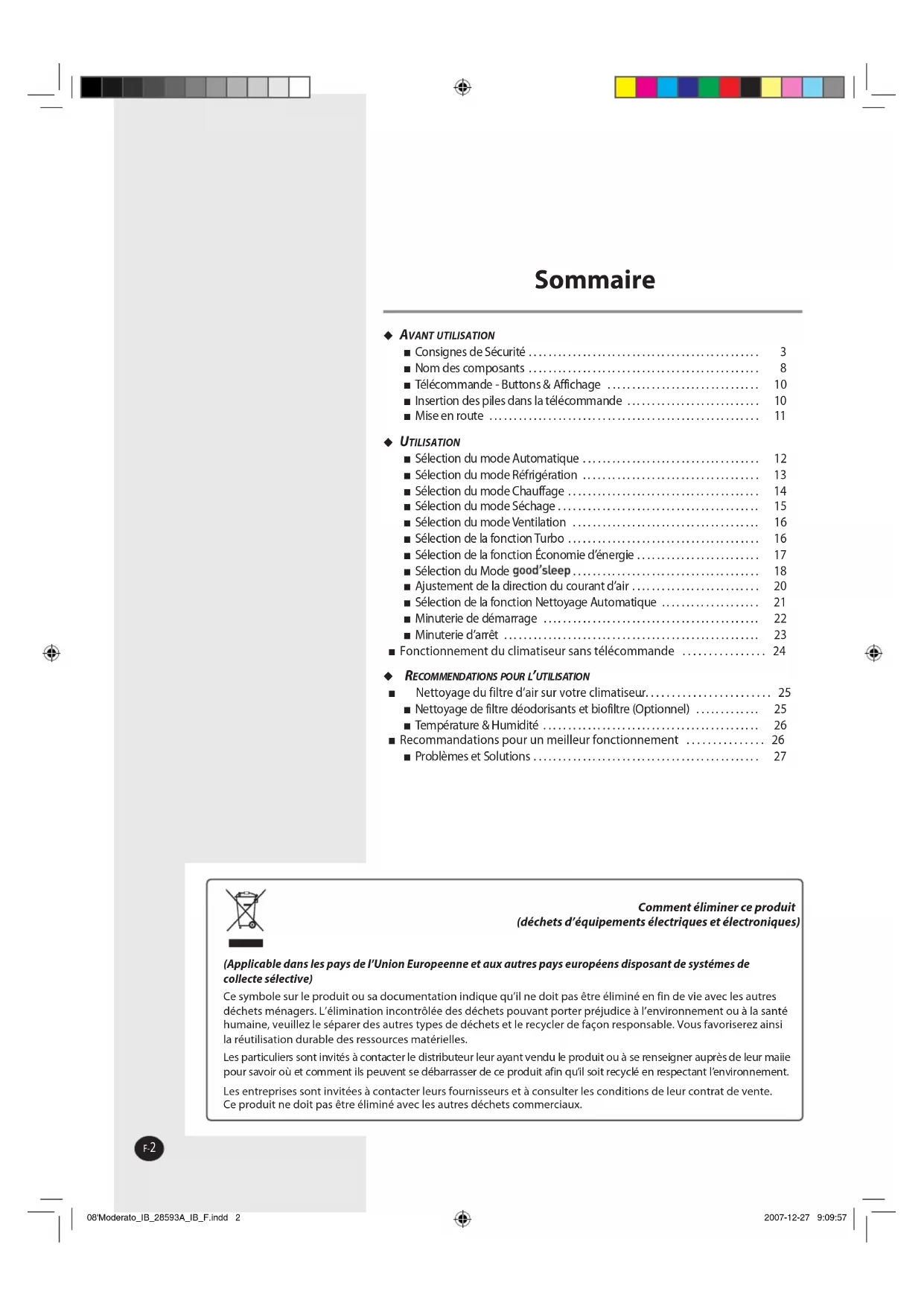 - Problèmes et Solutions Comment éliminer ce produit (déchets d’équipements électriques et électroniques) (Applicable dans les pays de l’Union Europeenne et aux autres pays européens disposant de systémes de collecte sélective) Ce symbole sur le produit ou sa documentation indique qu’il ne doit pas être éliminé en fin de vie avec les autres déchets ménagers. L’élimination incontrôlée des déchets pouvant porter préjudice à l’environnement ou à la santé humaine, veuillez le séparer des autres types de déchets et le recycler de façon responsable. Vous favoriserez ainsi la réutilisation durable des ressources matérielles. Les particuliers sont invités à contacter le distributeur leur ayant vendu le produit ou à se renseigner auprès de leur maiie pour savoir où et comment ils peuvent se débarrasser de ce produit afin qu’il soit recyclé en respectant l’environnement. Les entreprises sont invitées à contacter leurs fournisseurs et à consulter les conditions de leur contrat de vente. Ce produit ne doit pas être éliminé avec les autres déchets commerciaux. 08'Moderato_IB_28593A_IB_F.indd 2 2007-12-27 9:09:57F-3FRANÇAIS p. 27